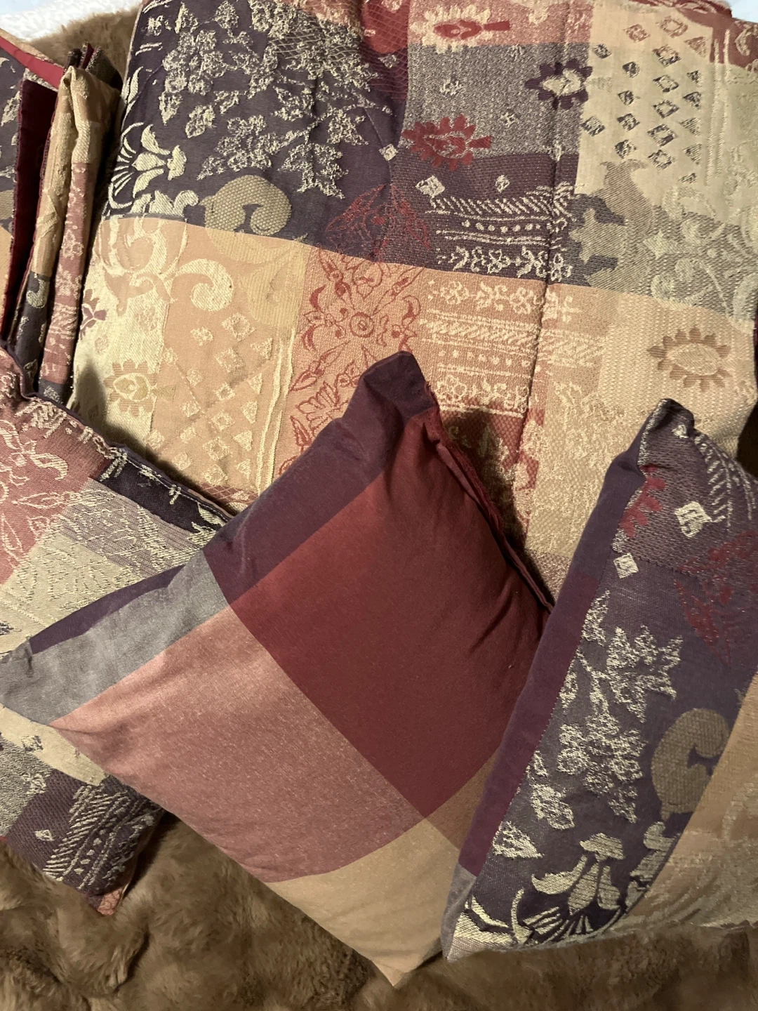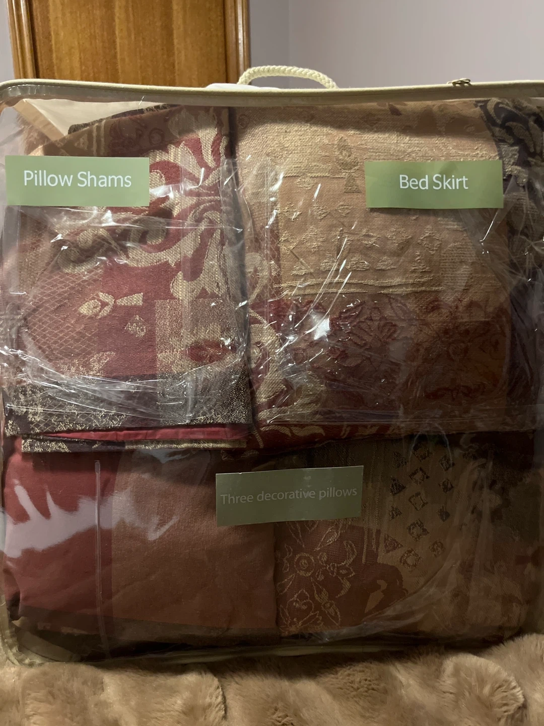 Queen comforter set includes a comforter that’s reversible. Two pillow shams, a bed skirt, and three decorative pillows are reversible as well. The fabric features a detailed jacquard pattern in warm tones. It's designed to update your bedroom decor. CASH only.