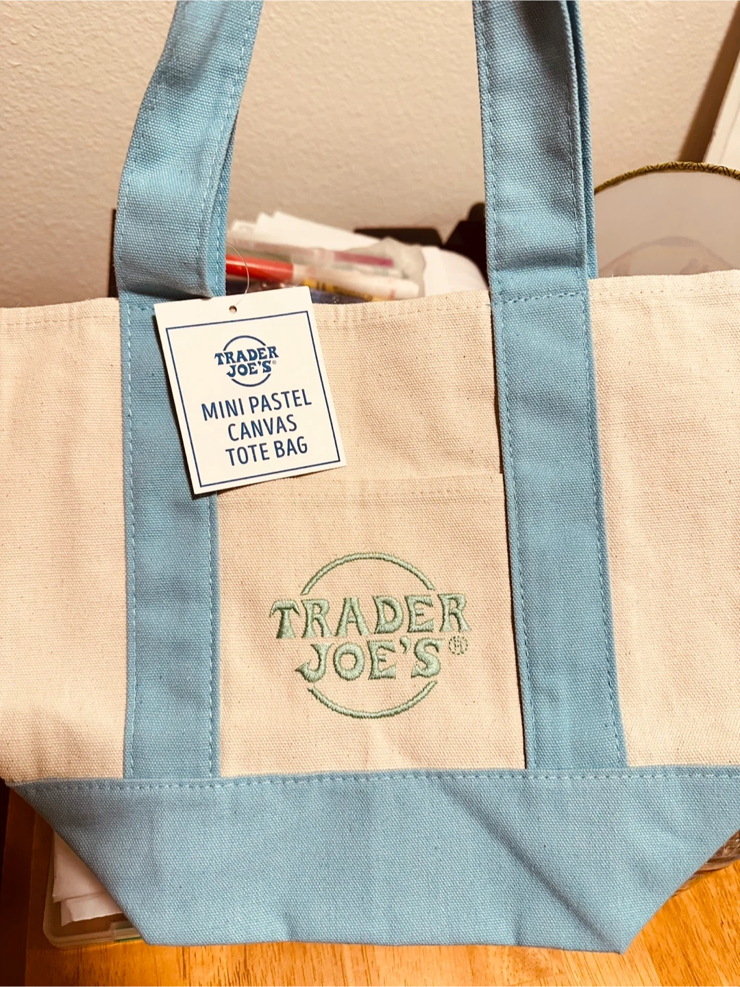 This is a Trader Joe's Mini Pastel Canvas Tote Bag. It's made of canvas material with pastel blue accents. This bag is perfect for quick errands or carrying small essentials.