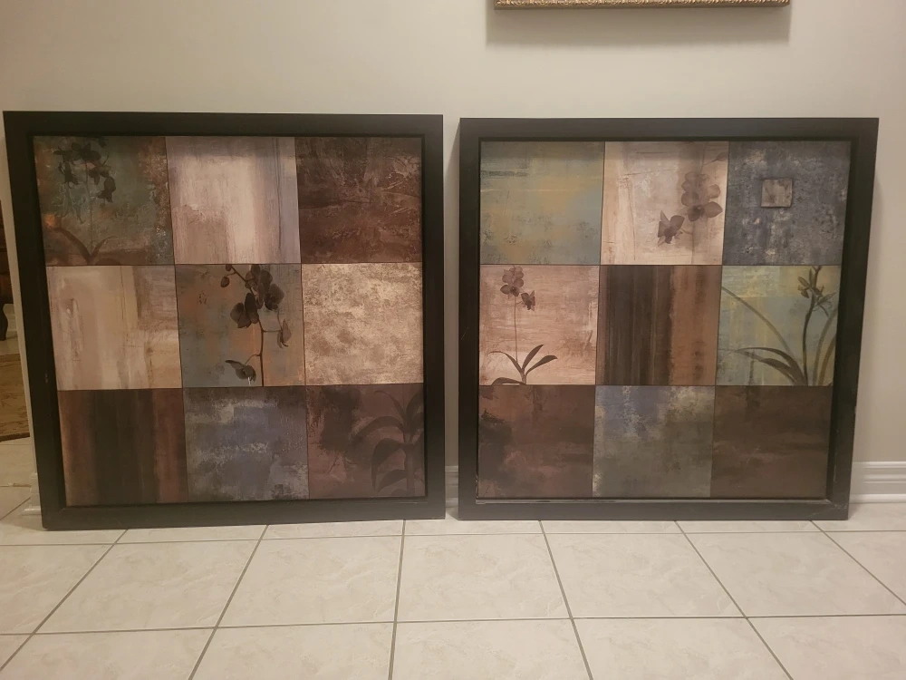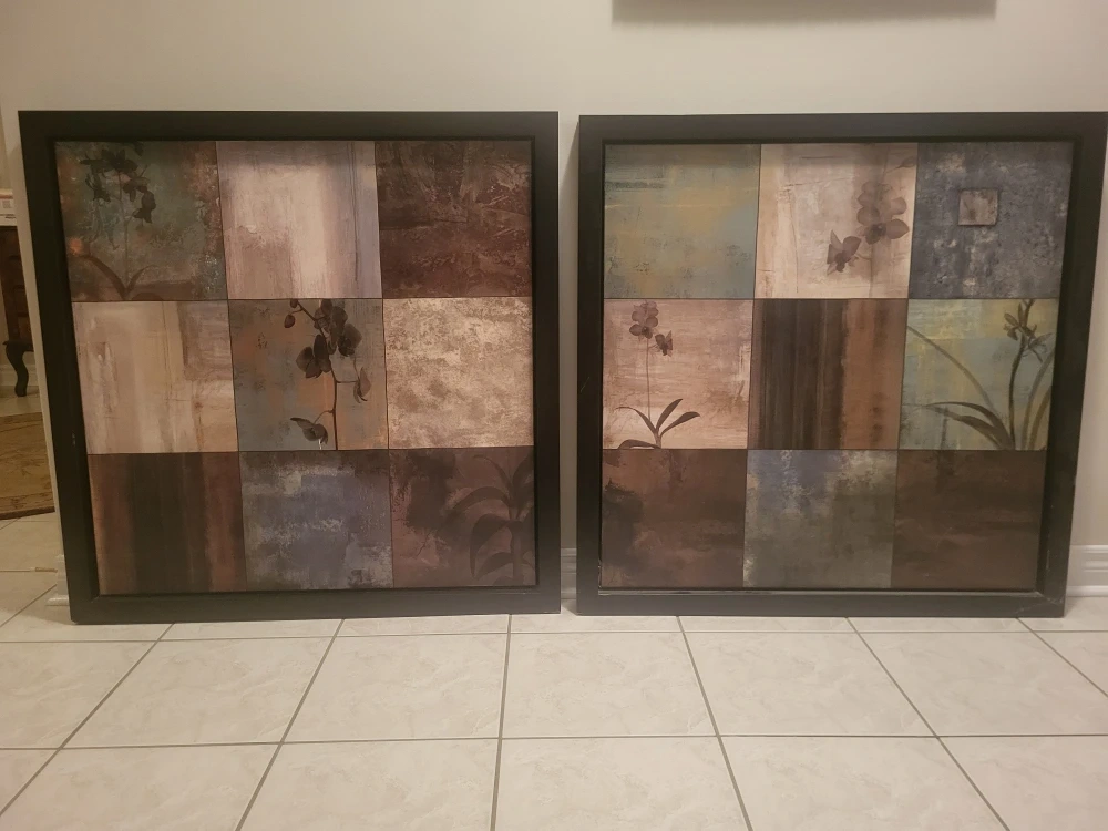 This is a set of two framed wall art pieces featuring an orchid design. The art is displayed on a tiled background with various earthy and muted tones. Each piece is housed in a dark, simple frame. They're great for adding a touch of nature and colour to any room.
