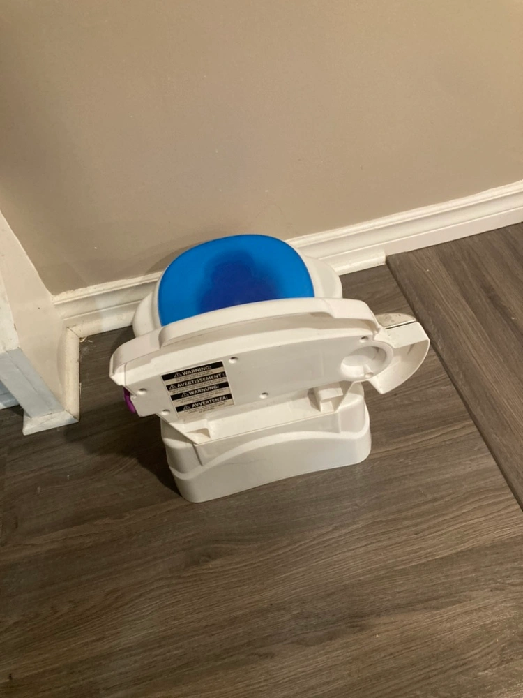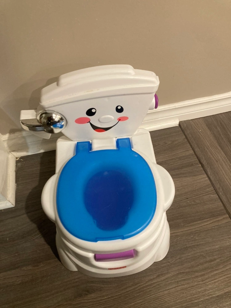This potty has a removable bowl for easy emptying. The lid flips up for easy access to the bowl. It also has a built-in handle.