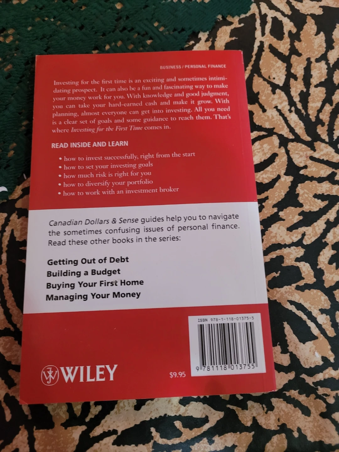 This book is titled 'Investing for the First Time' from Canadian Dollars & Sense. It guides you to navigate the sometimes confusing issues of personal finance. It includes how to invest successfully, how to set your investing goals, how much risk is right for you, how to diversify your portfolio and how to work with an investment broker