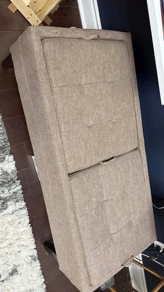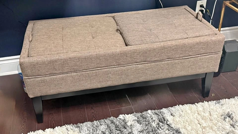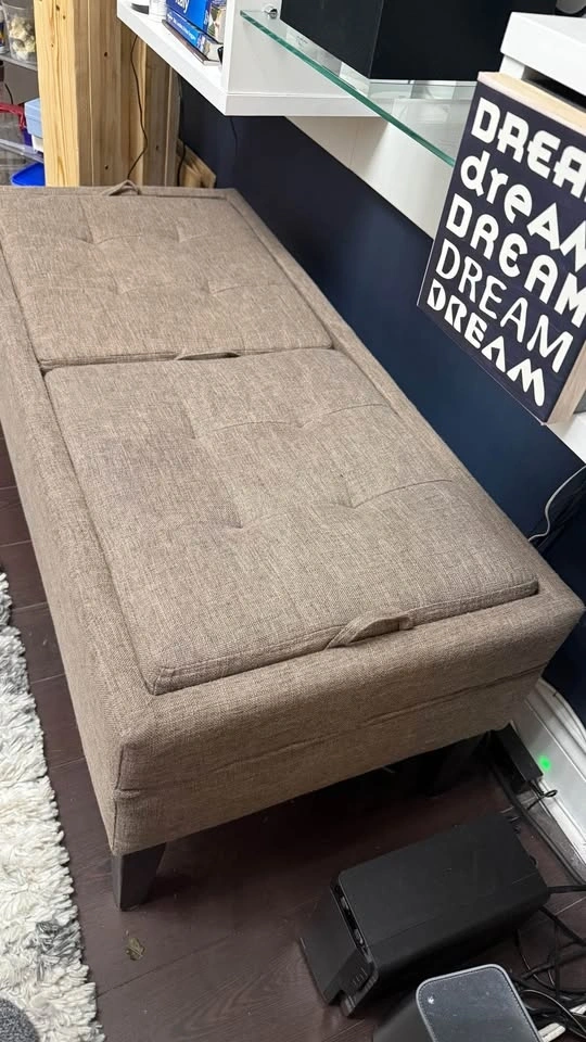 Upholstered storage ottoman with two flip-up lid sections giving access to a deep storage compartment inside. Great as a coffee table, footrest, or hidden storage solution. Solid dark wood legs. Fabric in good condition with no tears. Minor surface scuffs on the lid from normal use. Size: 41x19x17. From a smoke-free, pet-free home. Pick up only.