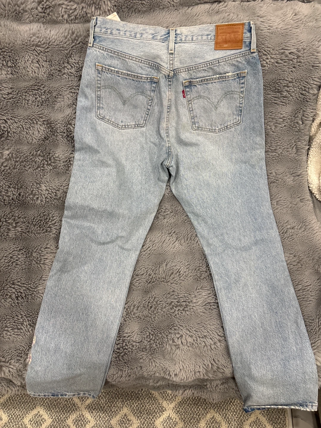 These light wash Levi's denim jeans have cute flower patches on the front and lower leg. They are a stylish addition to any wardrobe. Denim material.