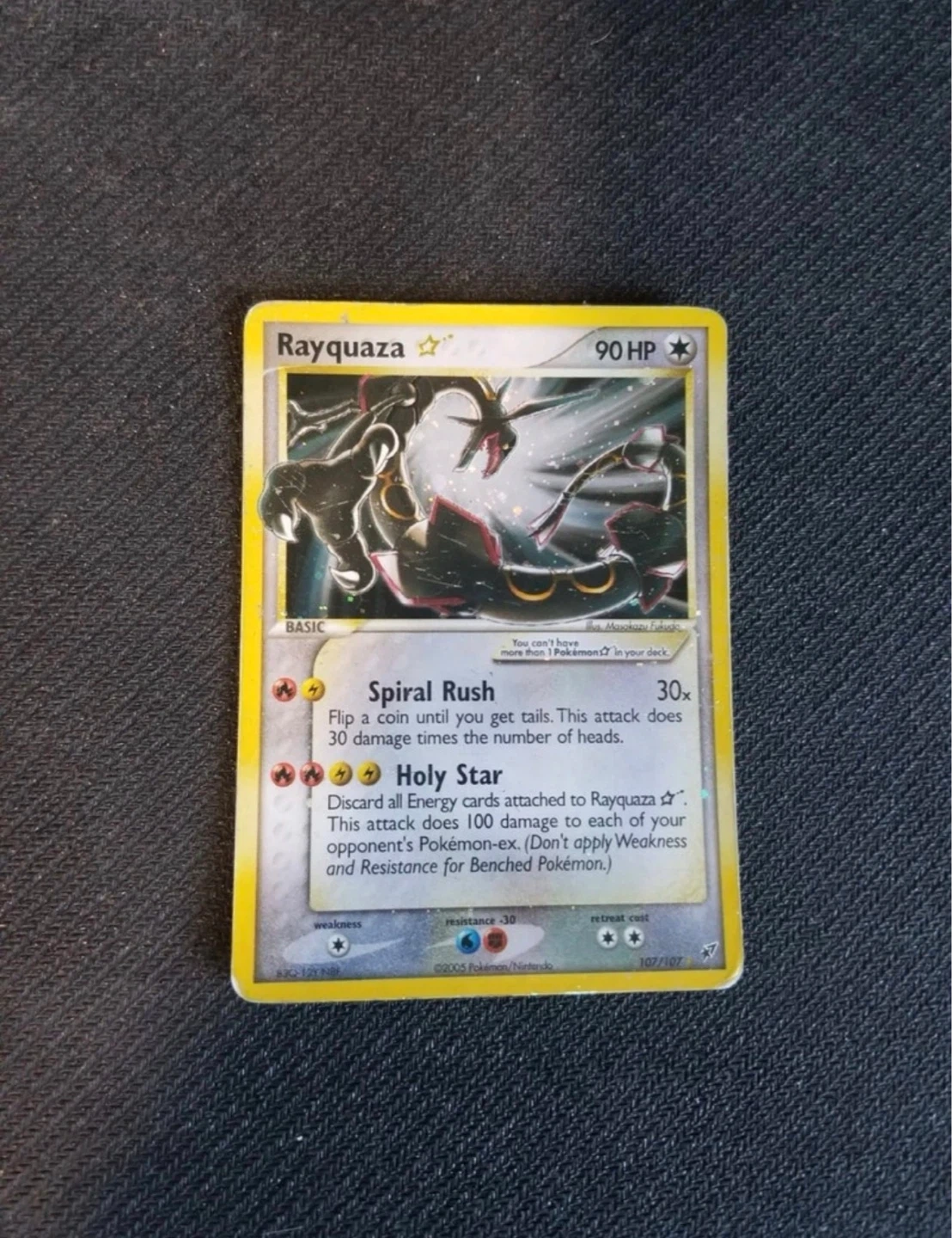 This is a Rayquaza Pokémon card from 2005. It has 90 HP and the Spiral Rush attack. The card's condition is clearly visible in the photos. It's a great addition for any Pokémon collector!
