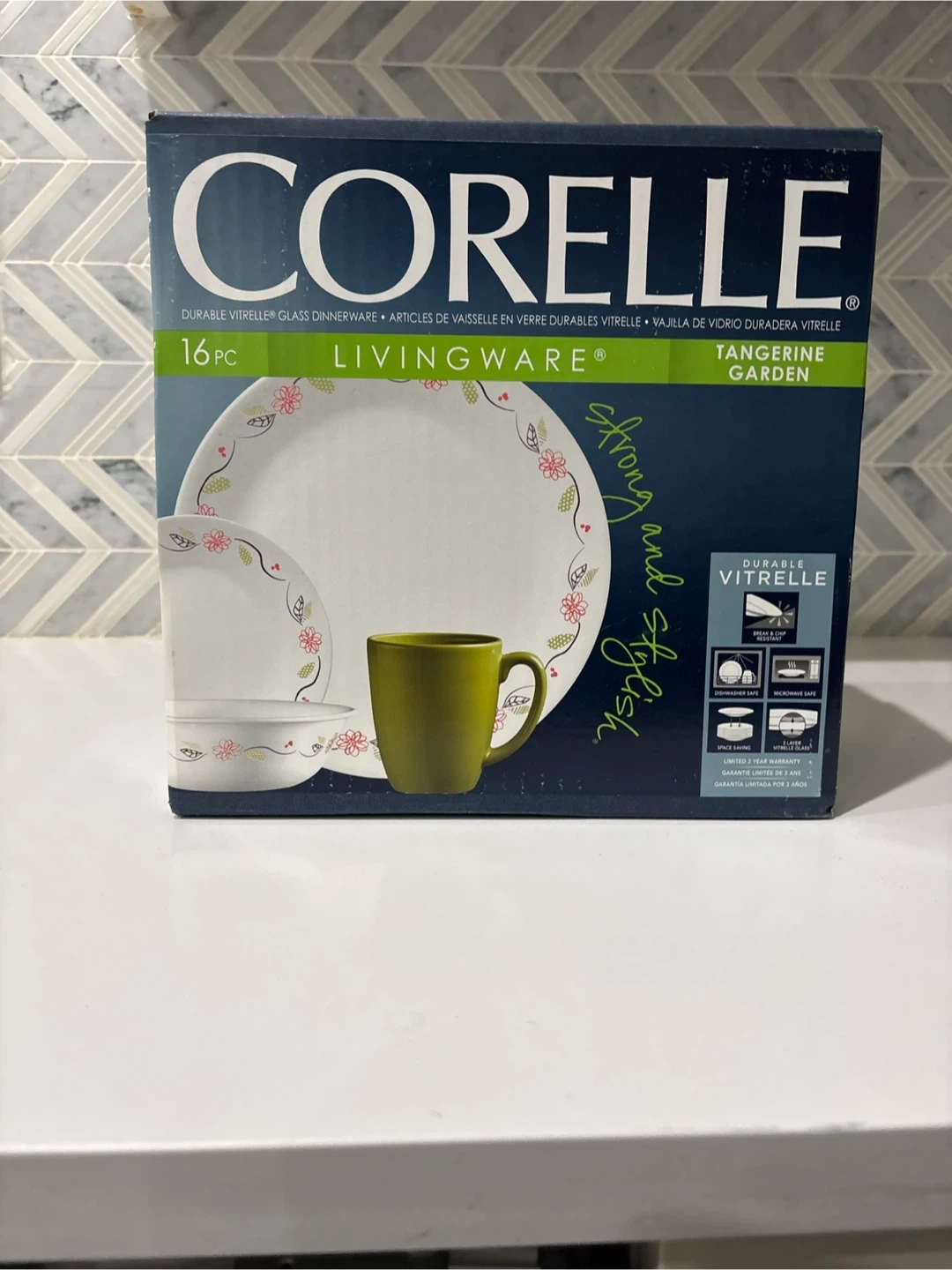 This is a 16-piece Corelle Livingware dinnerware set in the Tangerine Garden pattern. It's made from durable Vitrelle glass. The set is dishwasher, microwave, and space-saving friendly. It includes plates and bowls. This set would be great for everyday use or special occasions!