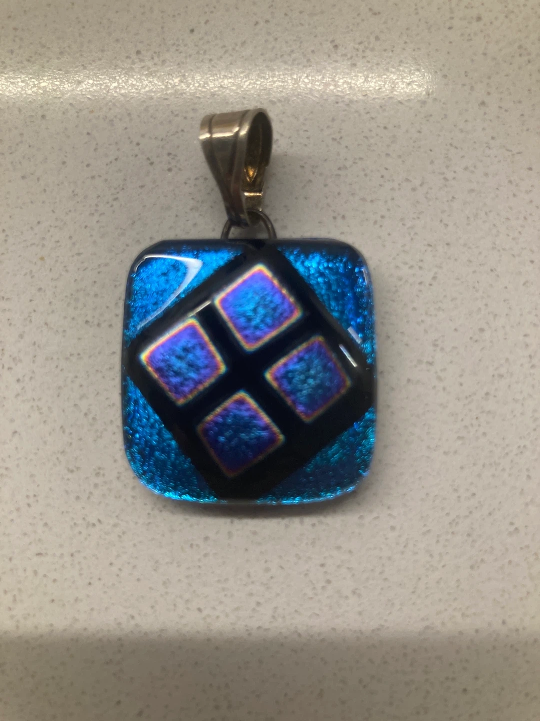 Square dichroic glass pendant with a blue and purple shimmering effect. Features a dark blue grid pattern in the centre. Sterling silver bail for hanging. Pendant is approximately 3cm tall and 2cm wide.