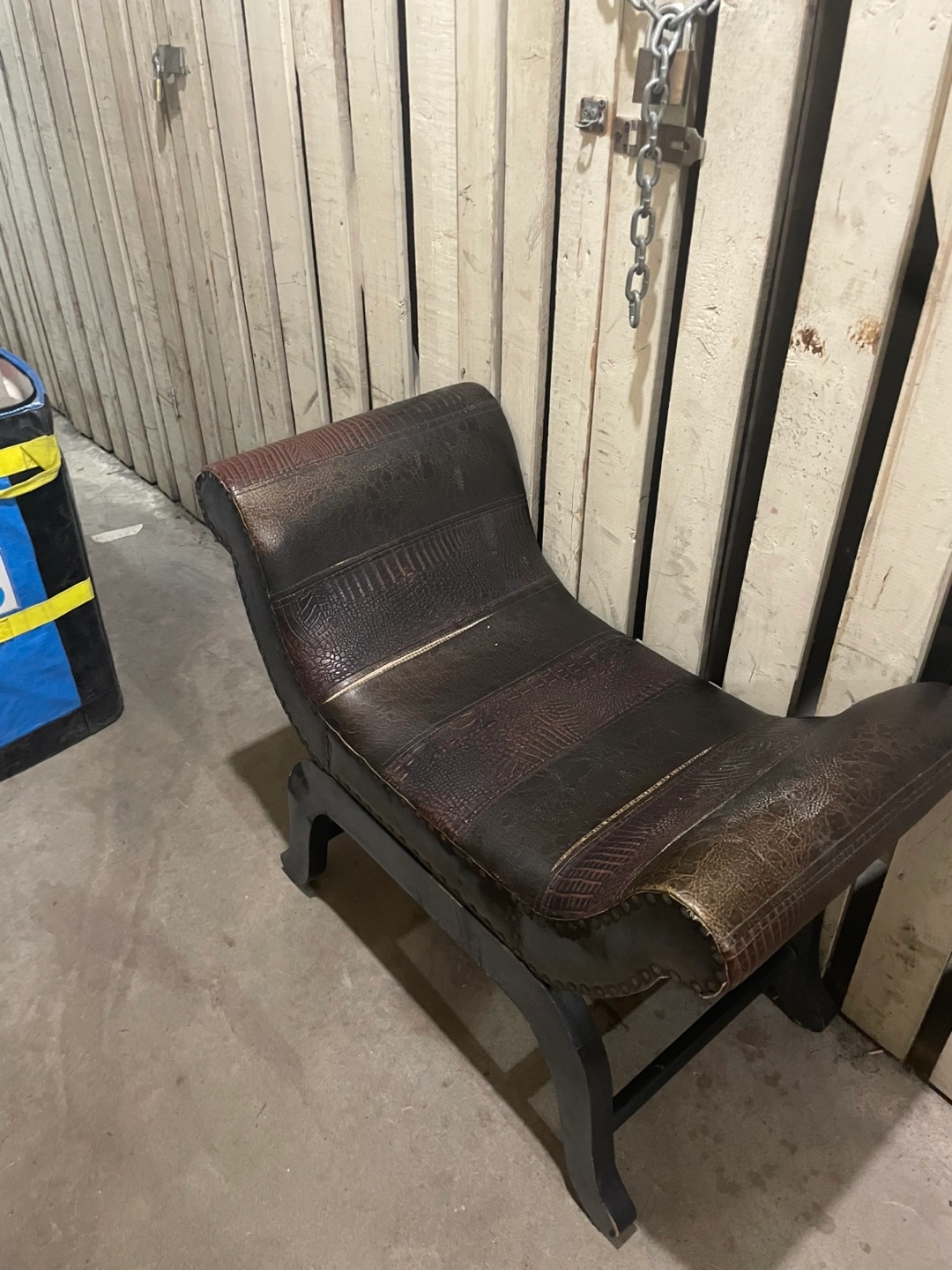 Selling a unique vintage bench with a brown leather seat. It has a distinctive design and would make a great addition to any room. The bench shows some signs of wear, adding to its vintage charm