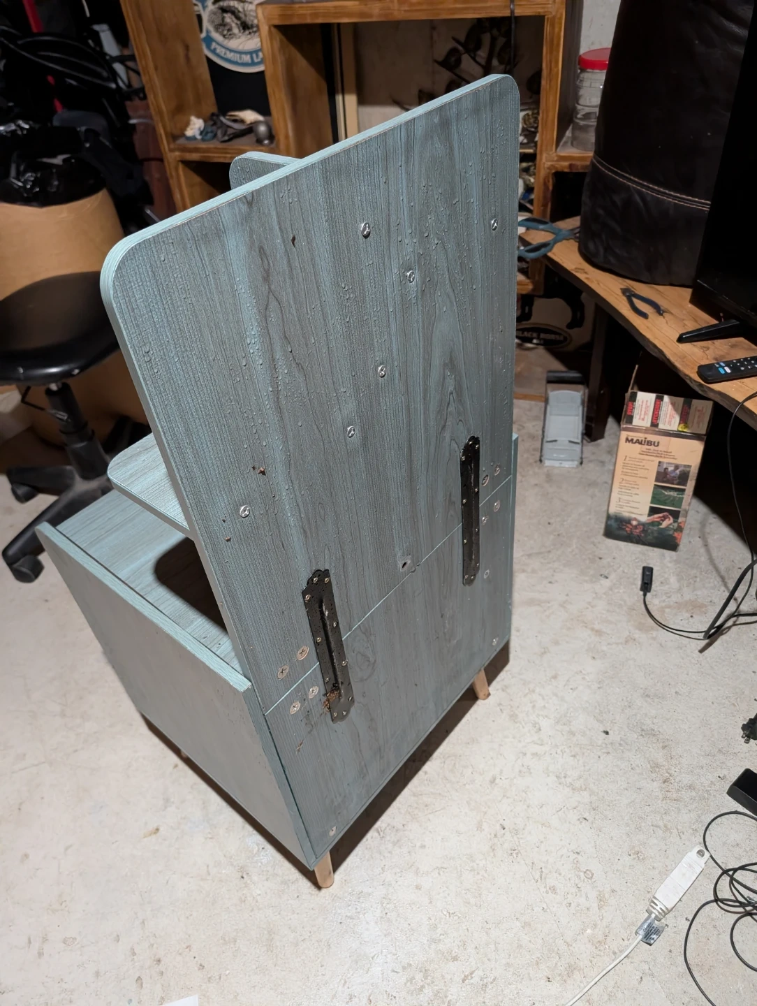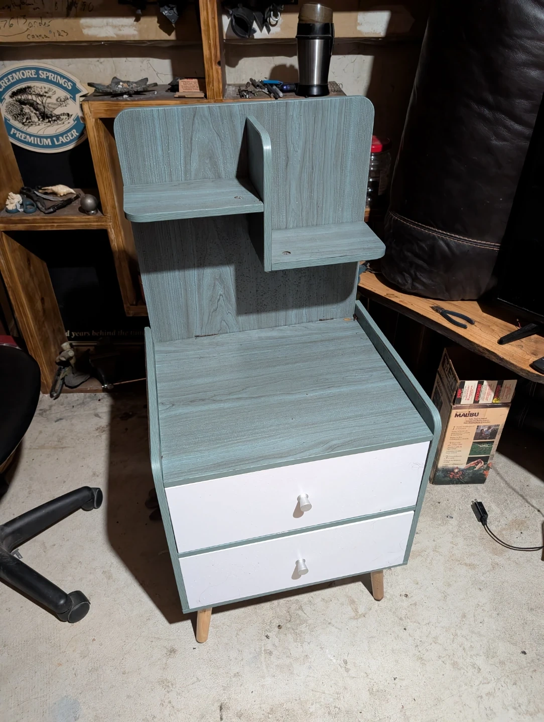 Selling a cute bedside table! It's got a unique design with shelves on top and two drawers at the bottom. The wood-look finish is a nice blue-grey colour, and the drawers are white. Perfect for adding some storage and style to your bedroom!