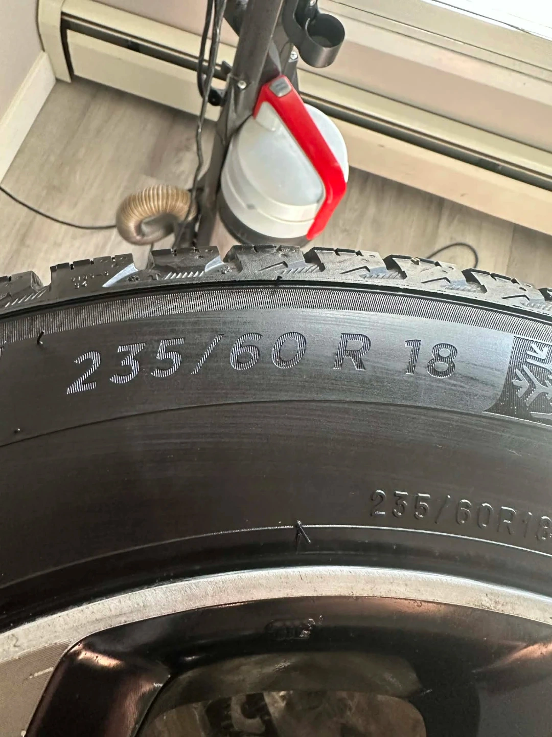 Set of four 235/60R18 Michelin X-Ice Snow SUV winter tires mounted on Honda OEM alloy wheels. These are great for Canadian winters, offering excellent traction on snow and ice. Come check them out!