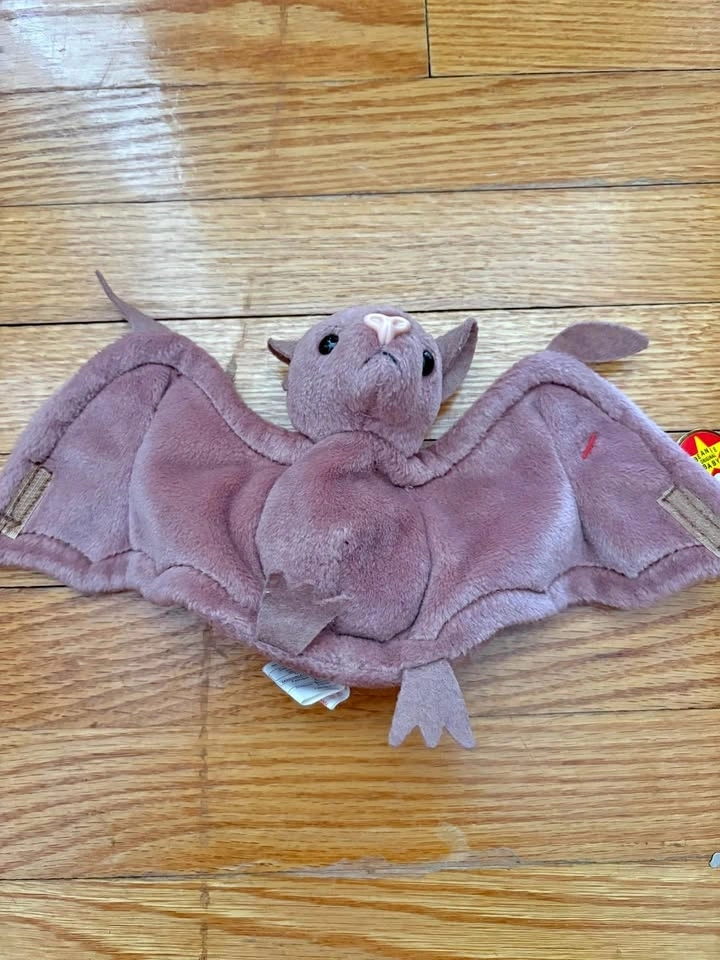 Soft brown plush bat with velcro on wing tips. This Ty Beanie Baby is made of polyester fiber and plastic pellets. It has tan felt ears and feet with a pink plastic nose.