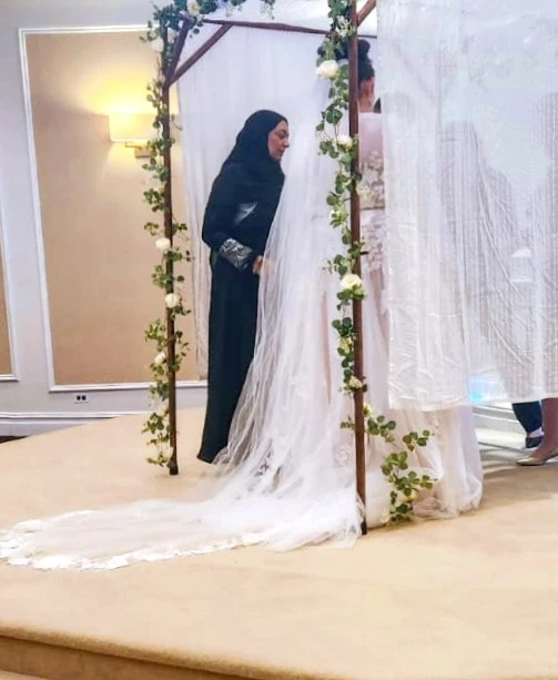 The seamstress made a custom bustle to keep the train off the floor for dancing. Size 3x so there's plenty of material to work with for for smaller bodies. The veil is included if you'd like it.