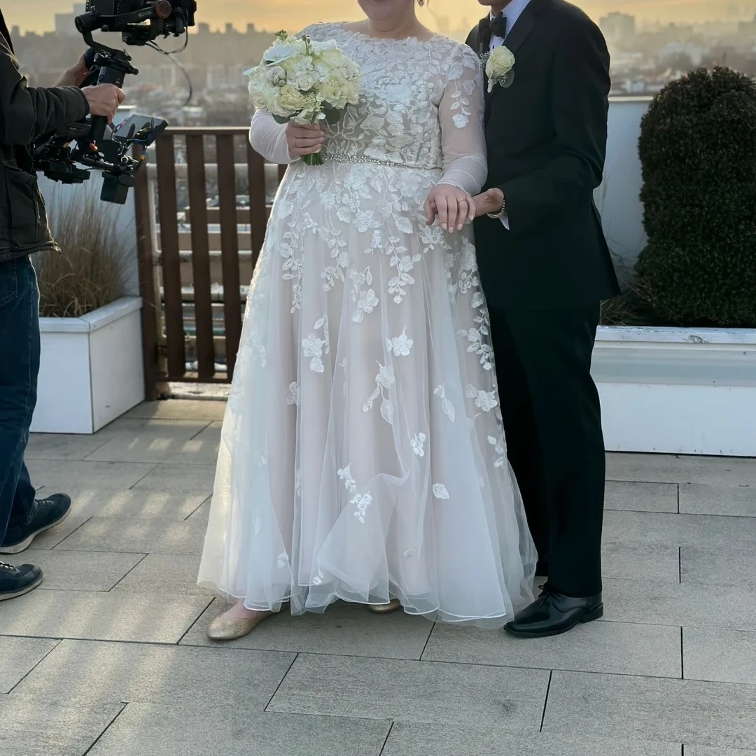 Here's a beautiful wedding dress that's ready for its next special day! It features delicate floral detailing and a flattering silhouette. Perfect for making unforgettable memories.