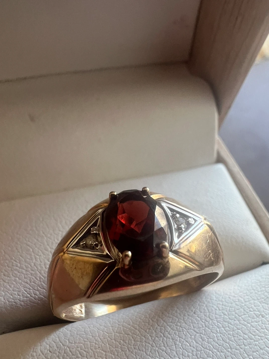 This is 10 k men's gold ring featuring a large oval garnet and two small diamonds on each side. The band is gold with a polished finish. It's set in a classic style.