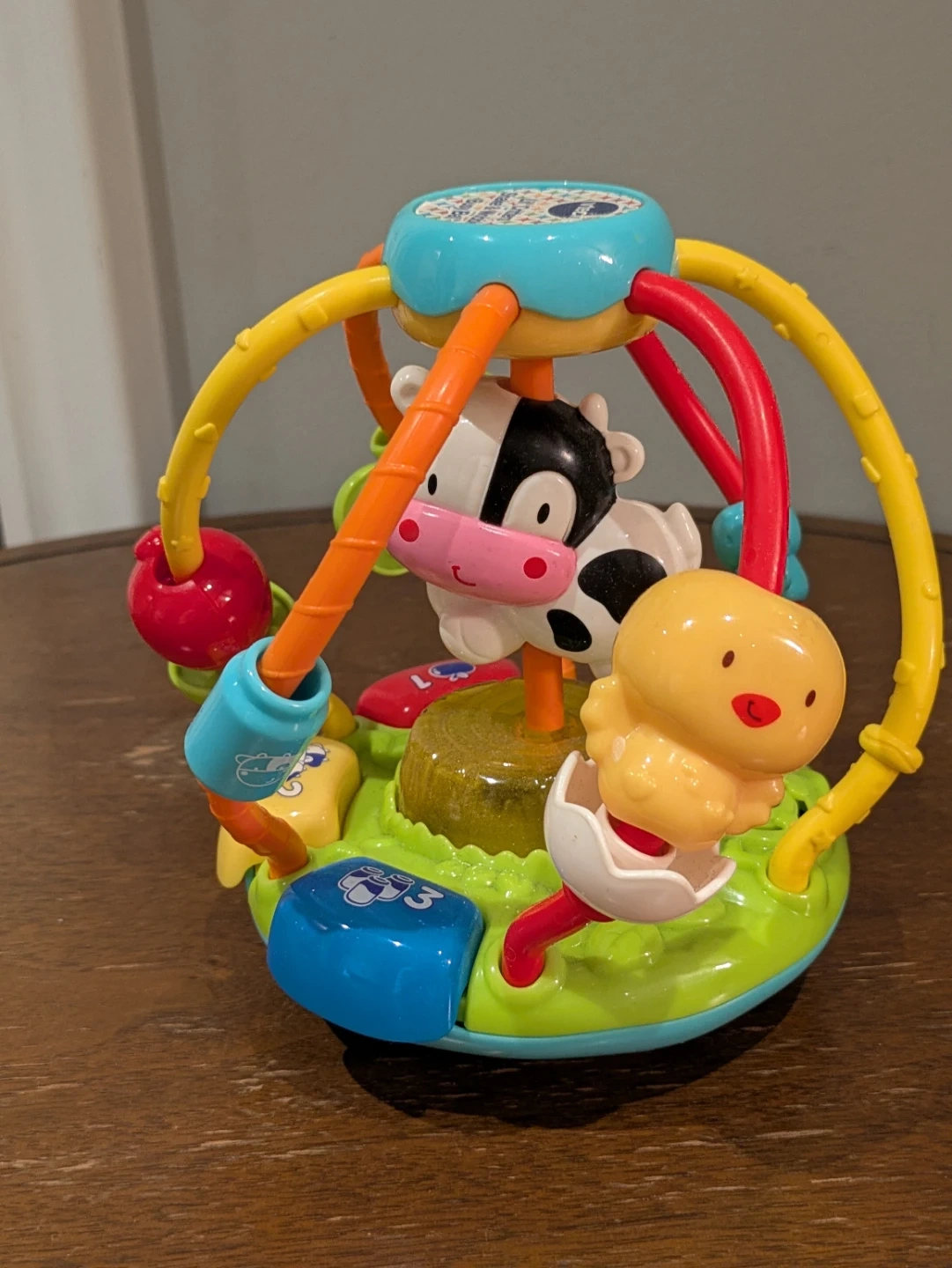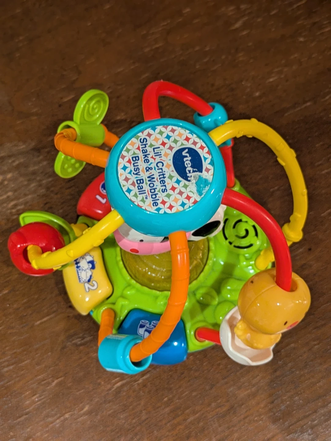 This is a VTech Lil' Critters Shake & Wobble Busy Ball. It is in a good condition and ready for a new little one to enjoy! It features colourful animals and shapes to stimulate your baby's senses and encourage motor skills development, along with sounds and music.