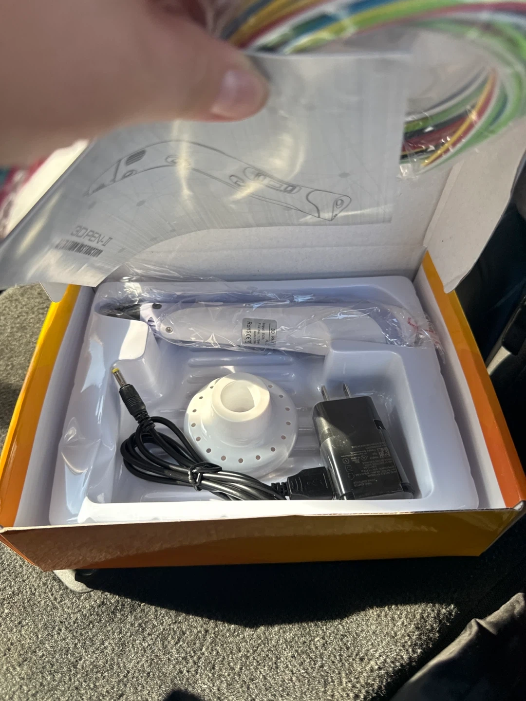 This 3D pen comes with multiple colours of PLA plastic feeding. It's designed for drawing your creations in 3D. The kit includes the pen, a stand, power adapter and PLA filaments.