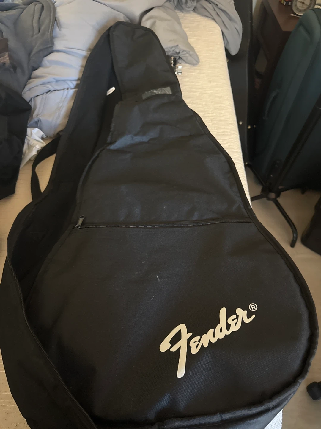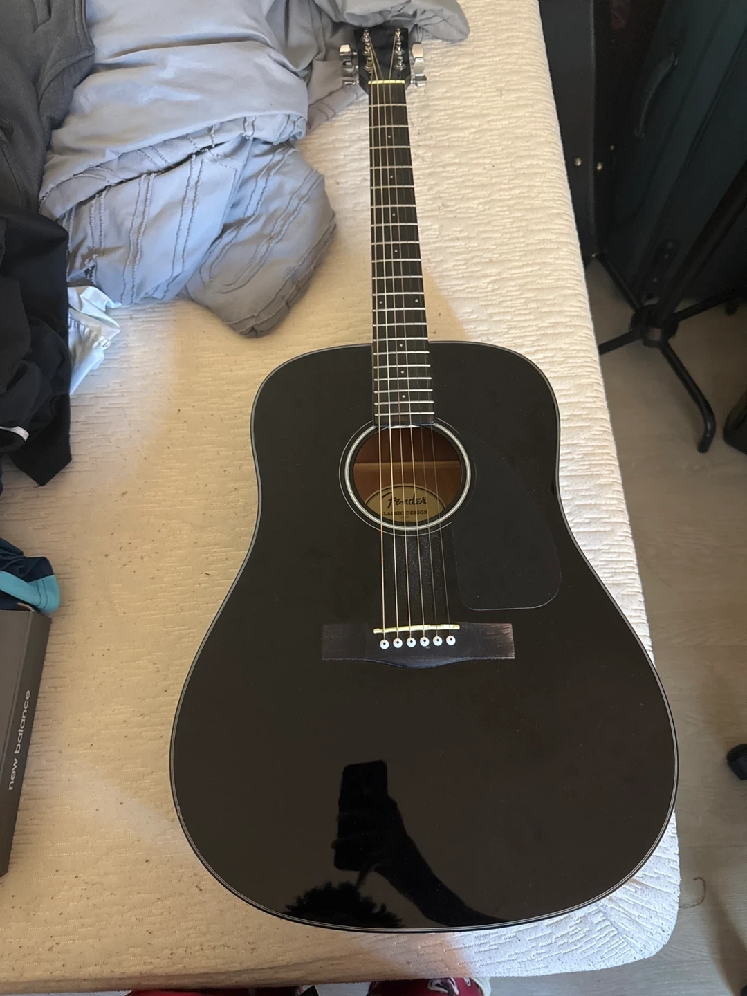 Fender CD-60 Dreadnought acoustic guitar in black. Comes with its original gig bag. Crafted in Indonesia. It has a very loud and warm sound so it’s great for both strumming and finger picking styles. If you have an electric acoustic guitar and willing to trade let me know