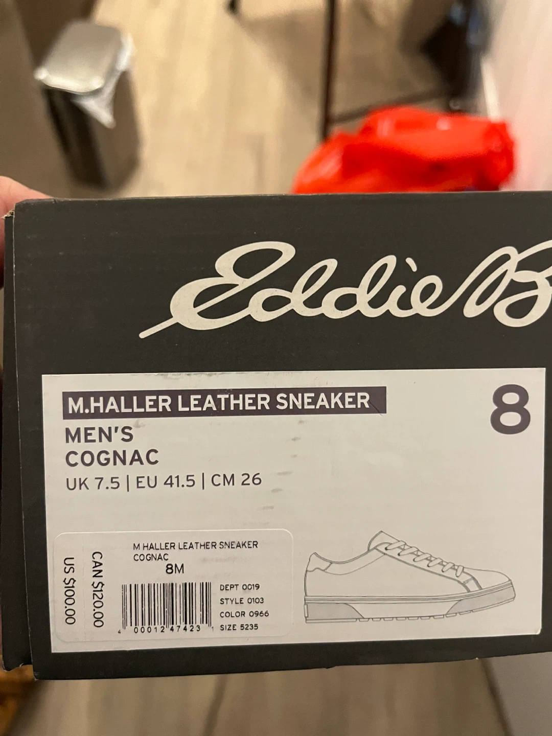 Men's Eddie Bauer M. Haller leather sneakers in cognac. Features a classic lace-up design with a durable rubber sole. Includes original box. US 8 Size.