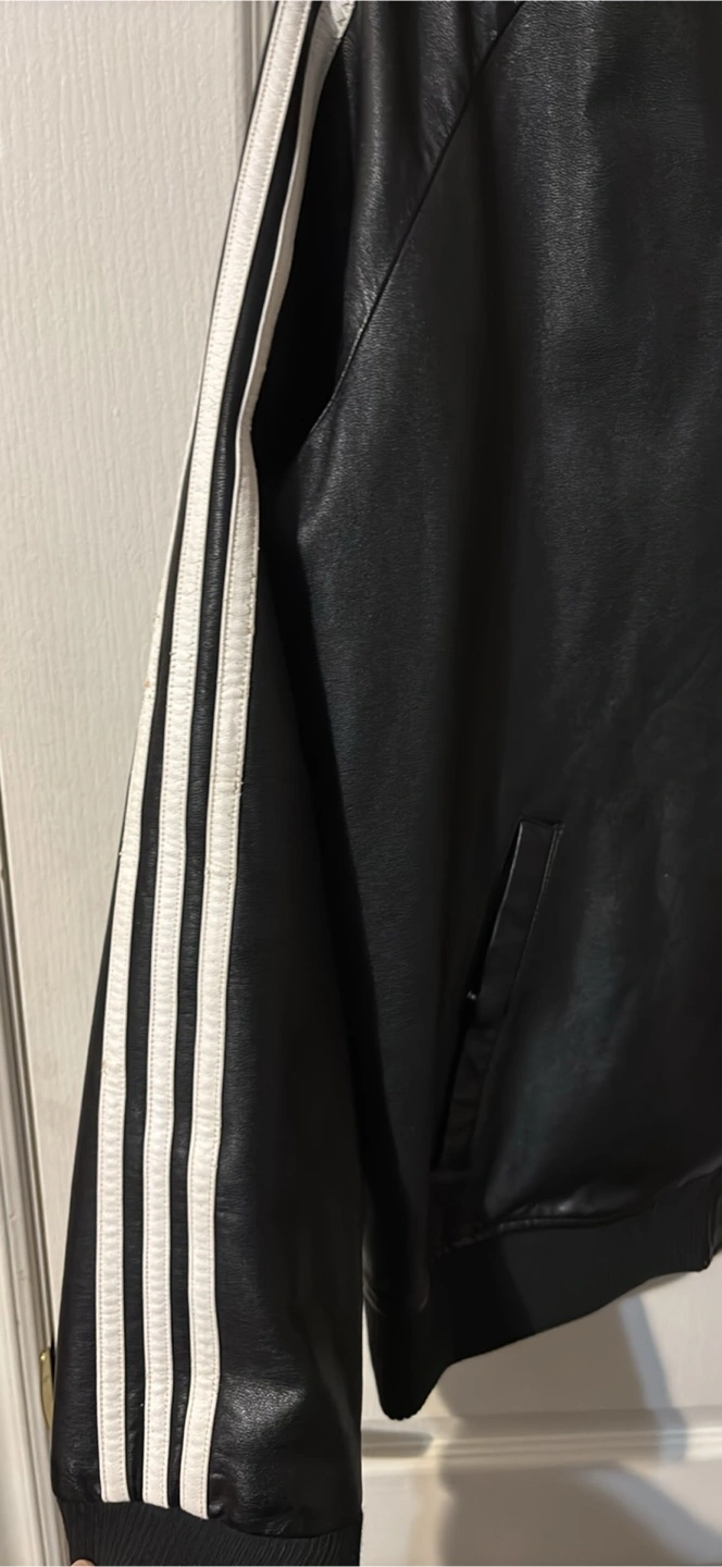 Selling an Adidas faux leather jacket in black. It features the classic three stripes on the sleeves. There are some marks on the stripes as shown in the pictures.