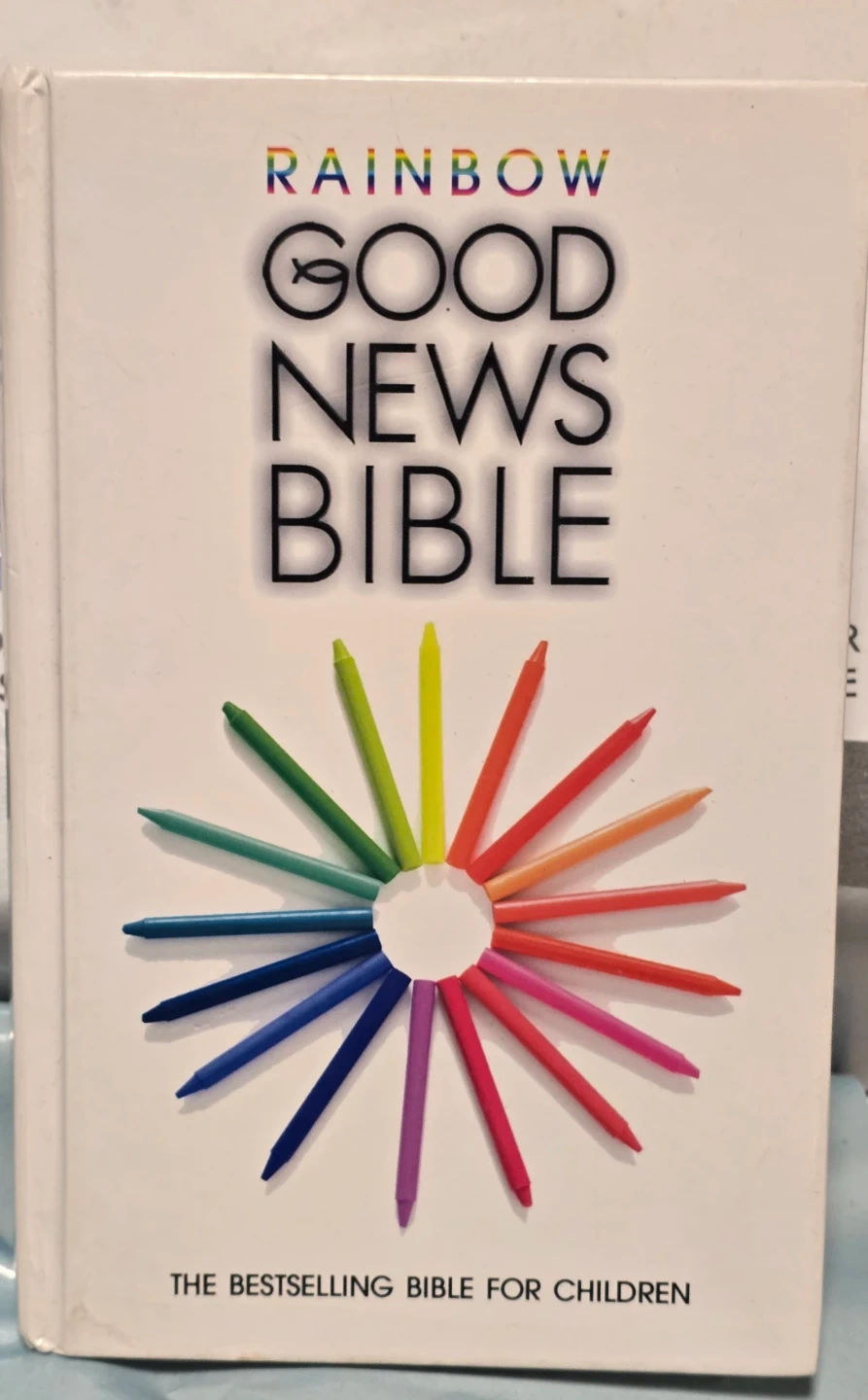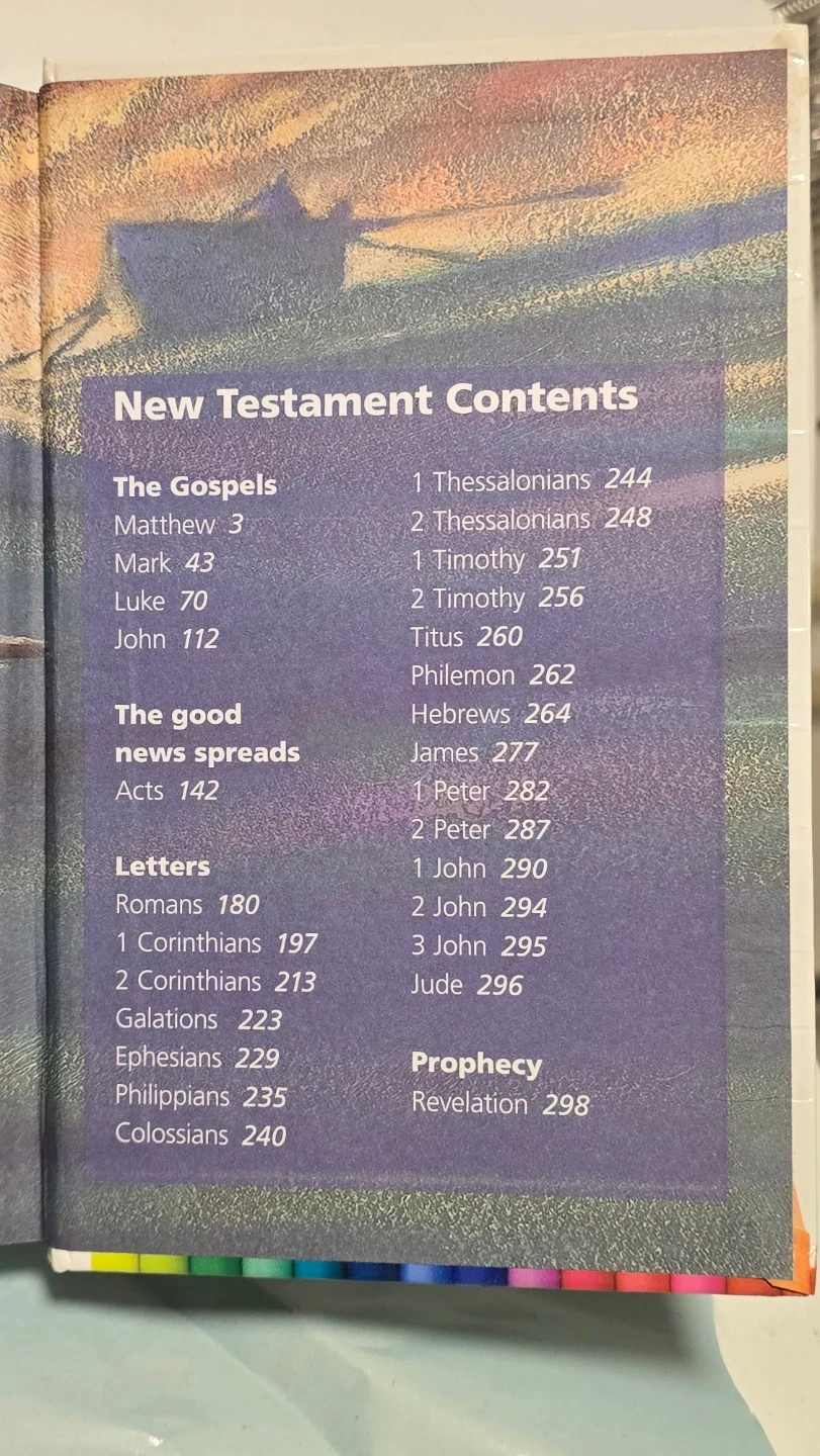 This is the Rainbow Good News Bible, a bestselling edition for children. It includes the Old and New Testament contents. This edition is suitable for young readers.