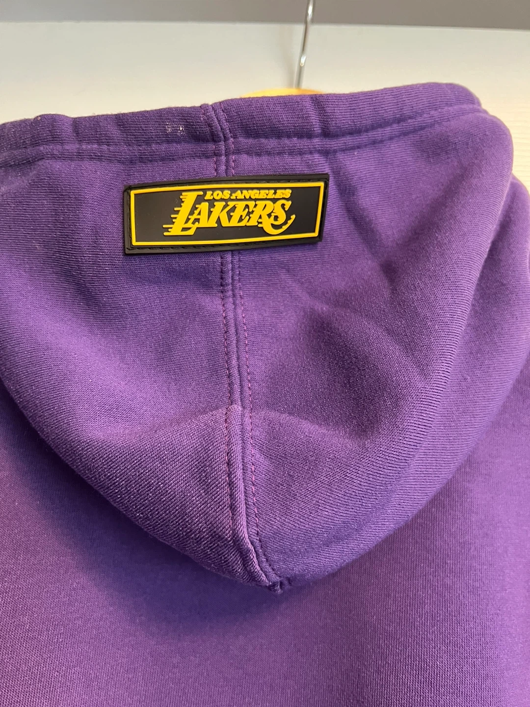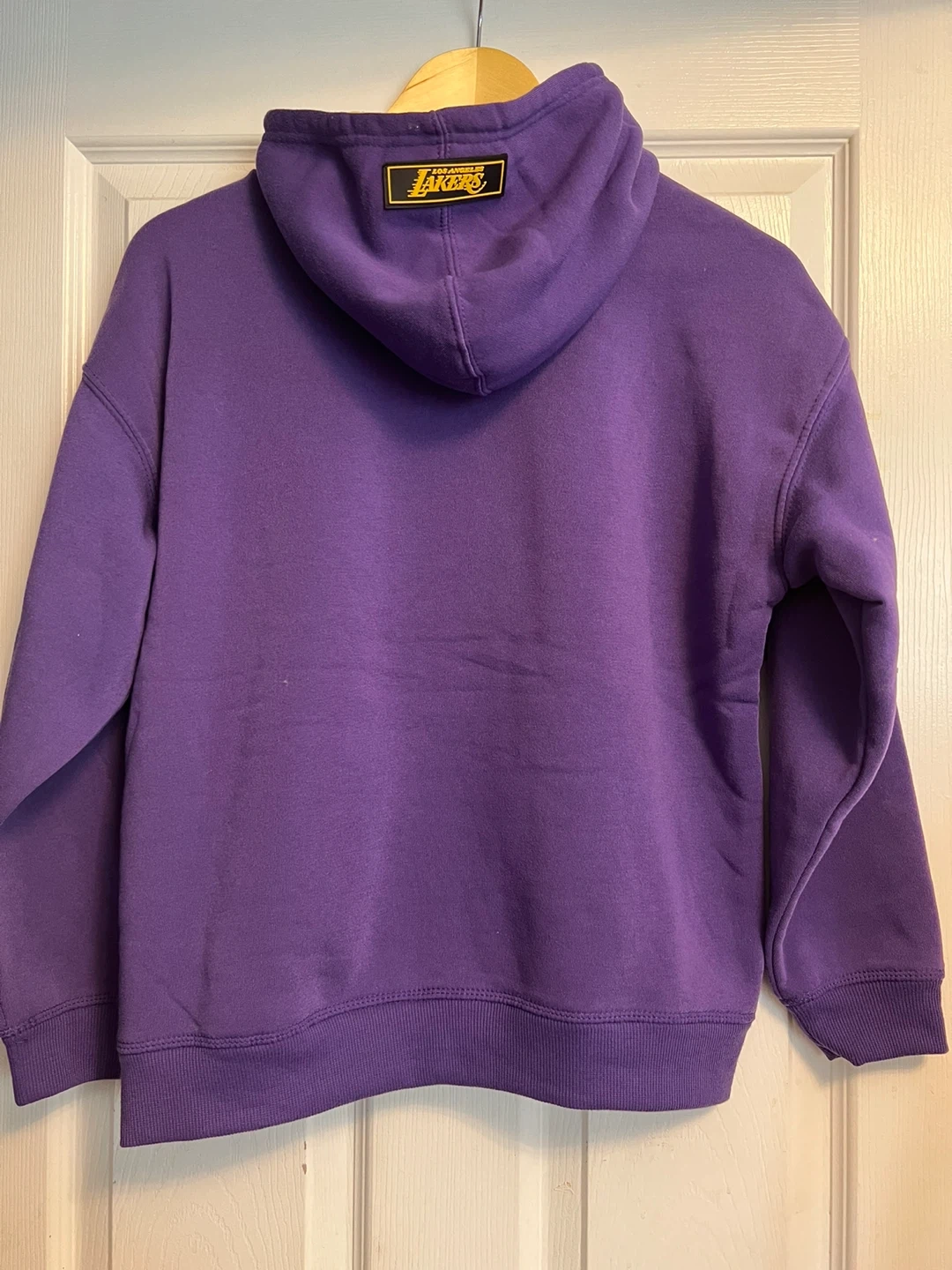 This is a Los Angeles Lakers purple hooded sweatshirt. It features the team's logo prominently on the front. It has a front kangaroo pocket and a yellow-lined hood. Size 14-16 youth.