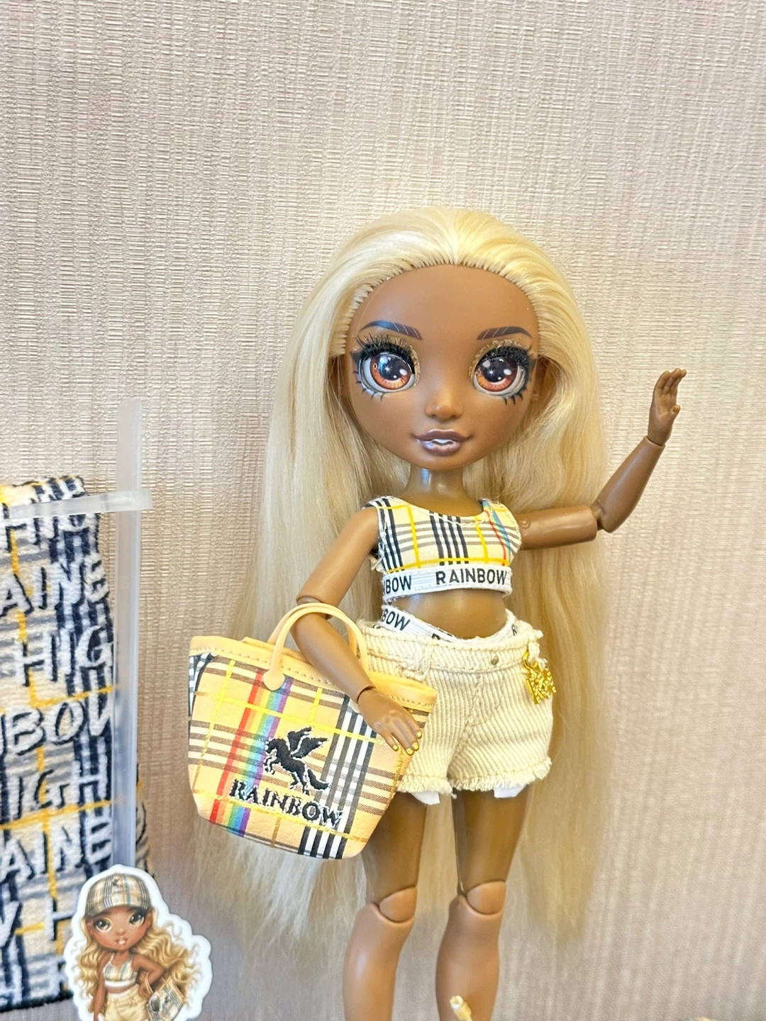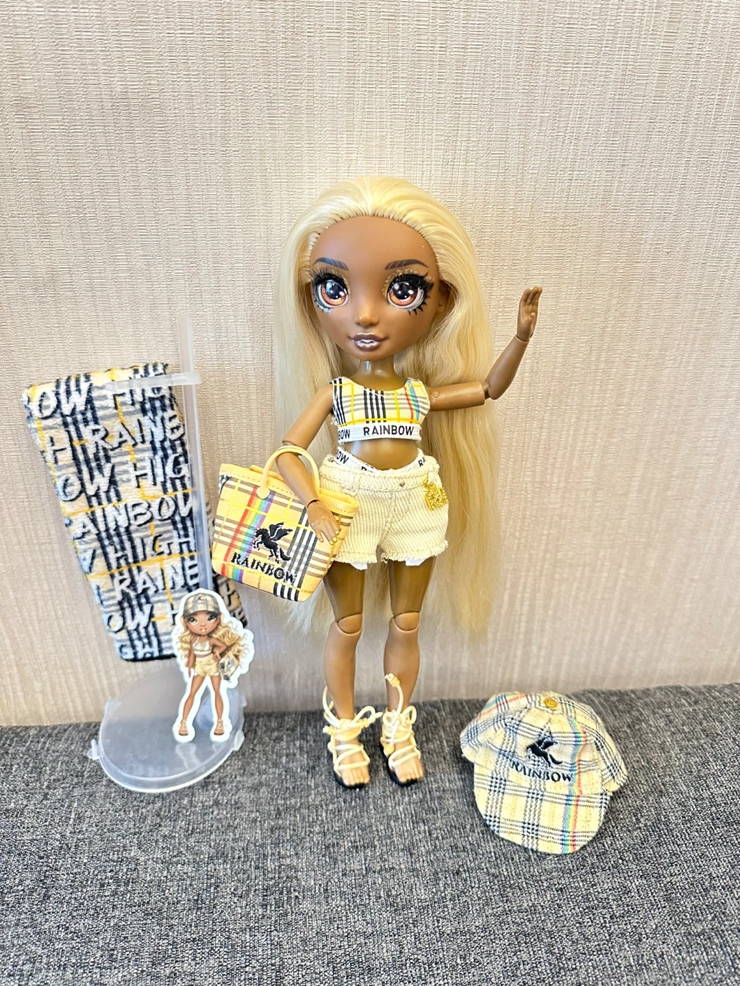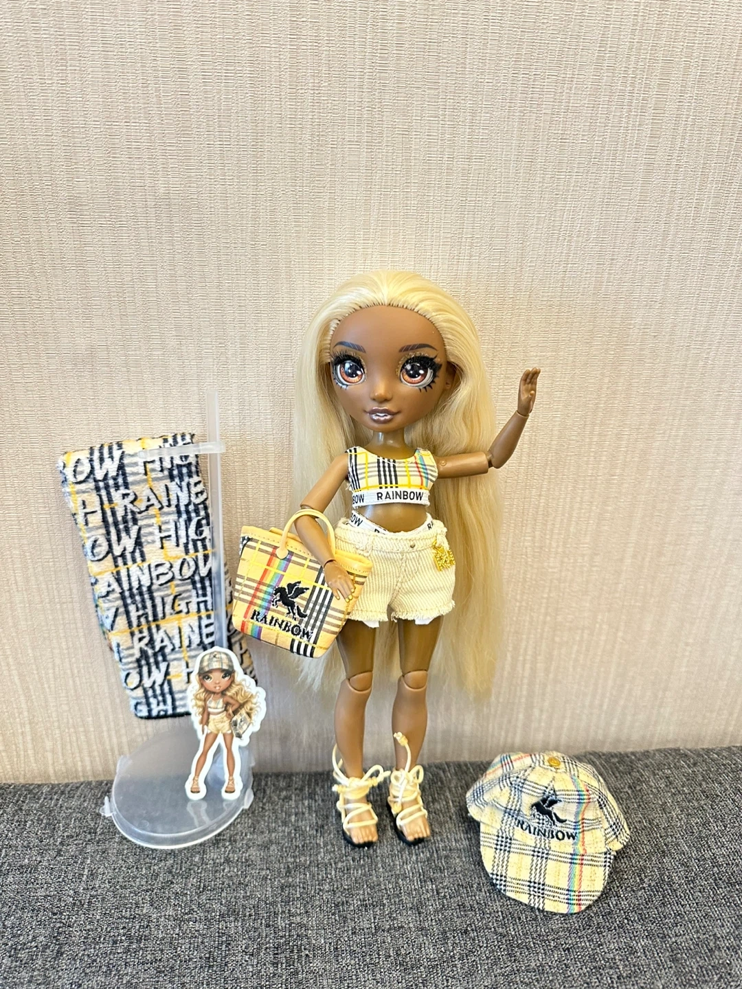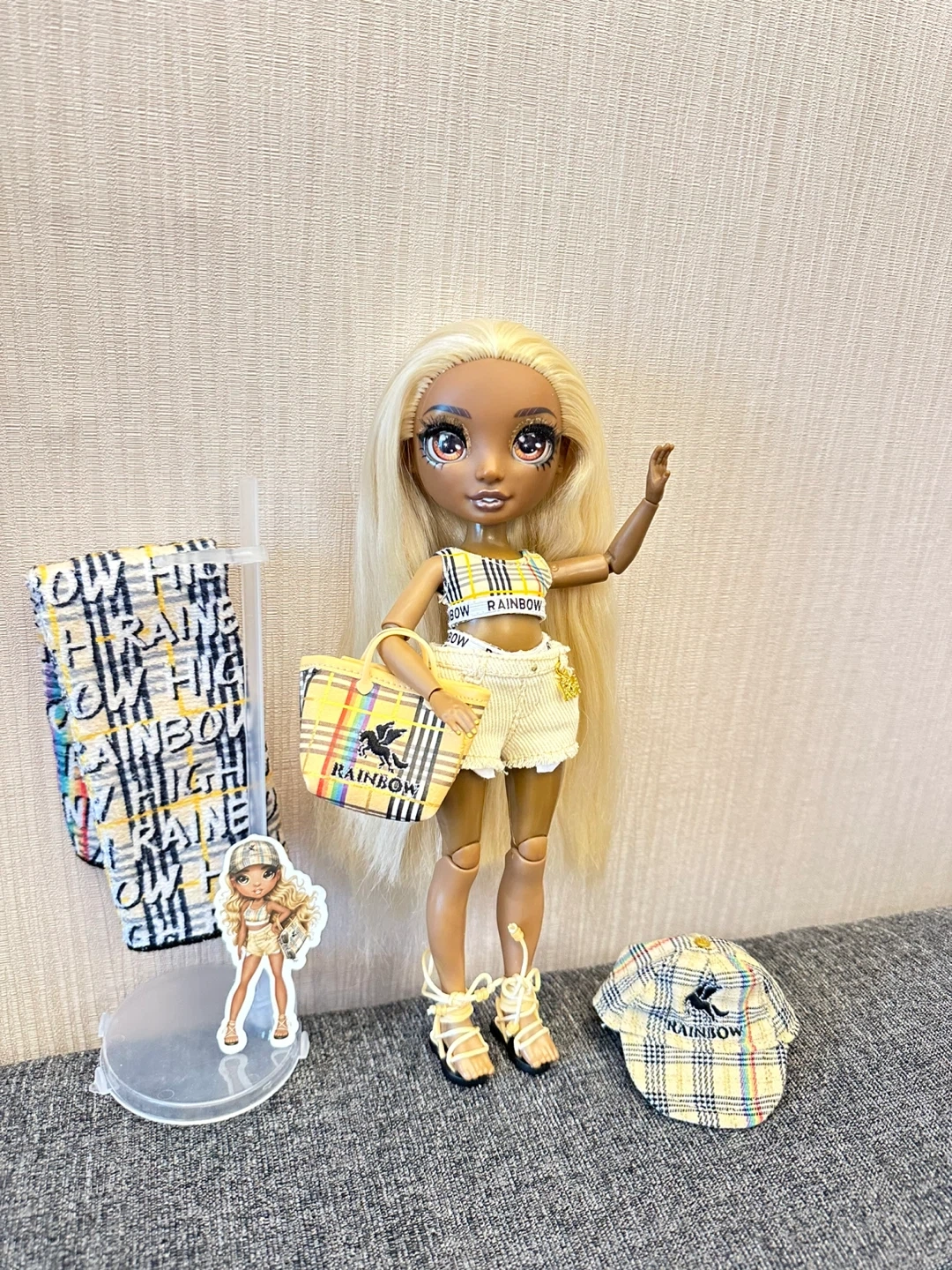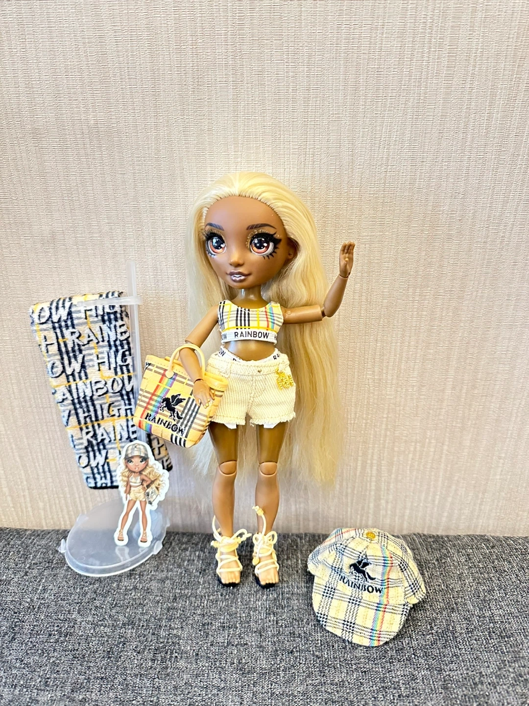 This Rainbow High doll is ready for a day out. It's dressed in a yellow plaid outfit with matching accessories. Includes a purse, hat, and other items.
