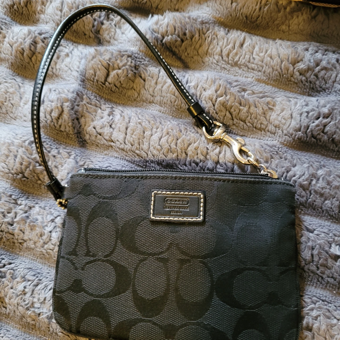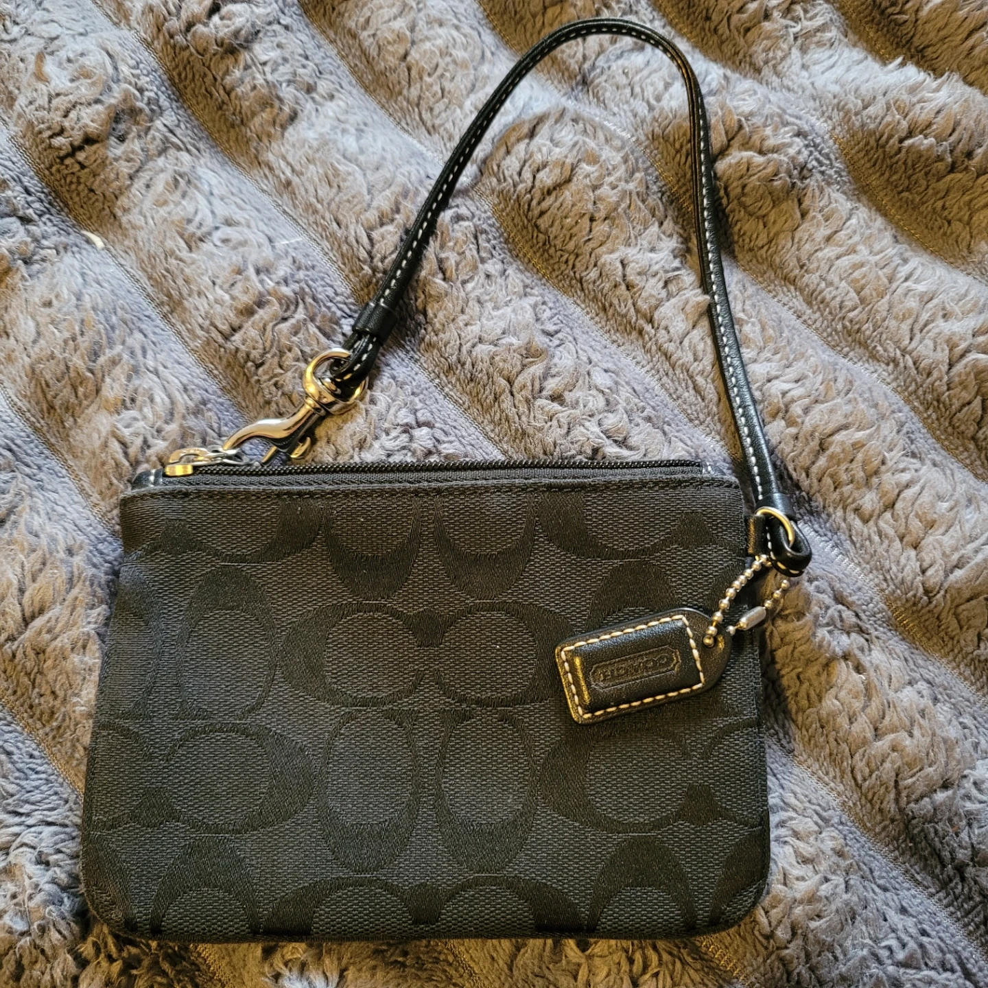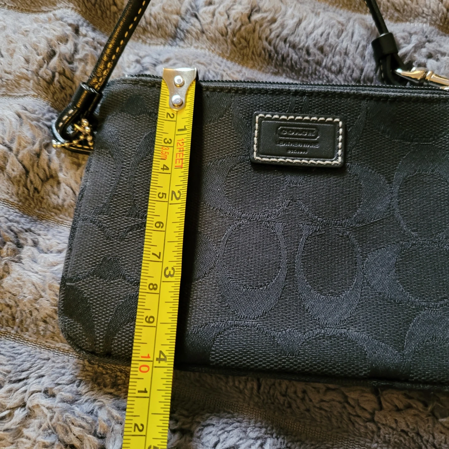Coach black signature C pattern wristlet pouch. Includes original leather hang tag and detachable wrist strap. Fabric interior. Measures approximately 6" wide by 4" tall.