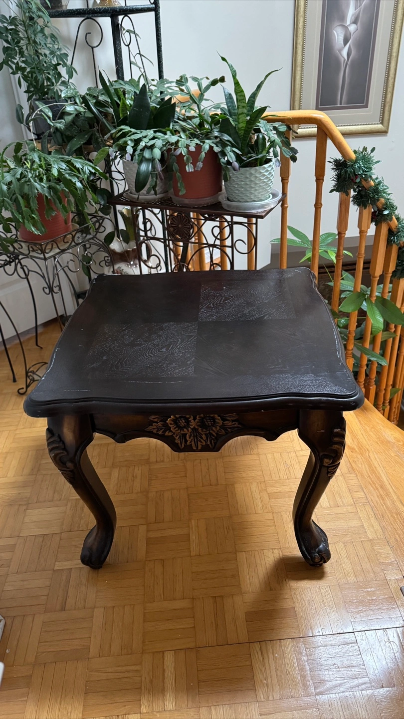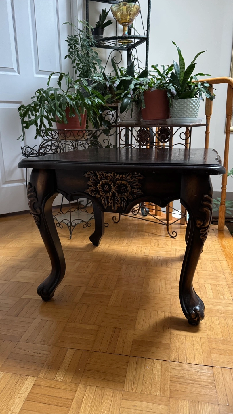Selling a dark brown wooden side table. It has a classic design with ornate legs and a decorative floral detail along the edge. Perfect for adding a touch of elegance to any room!
