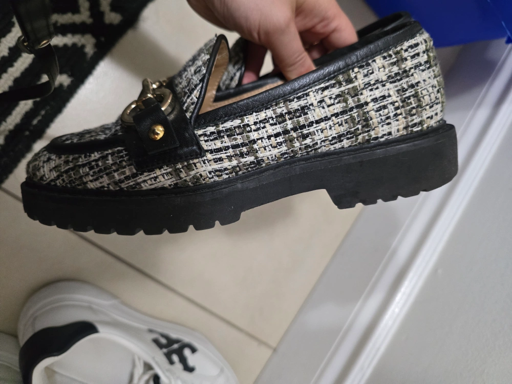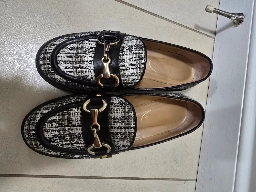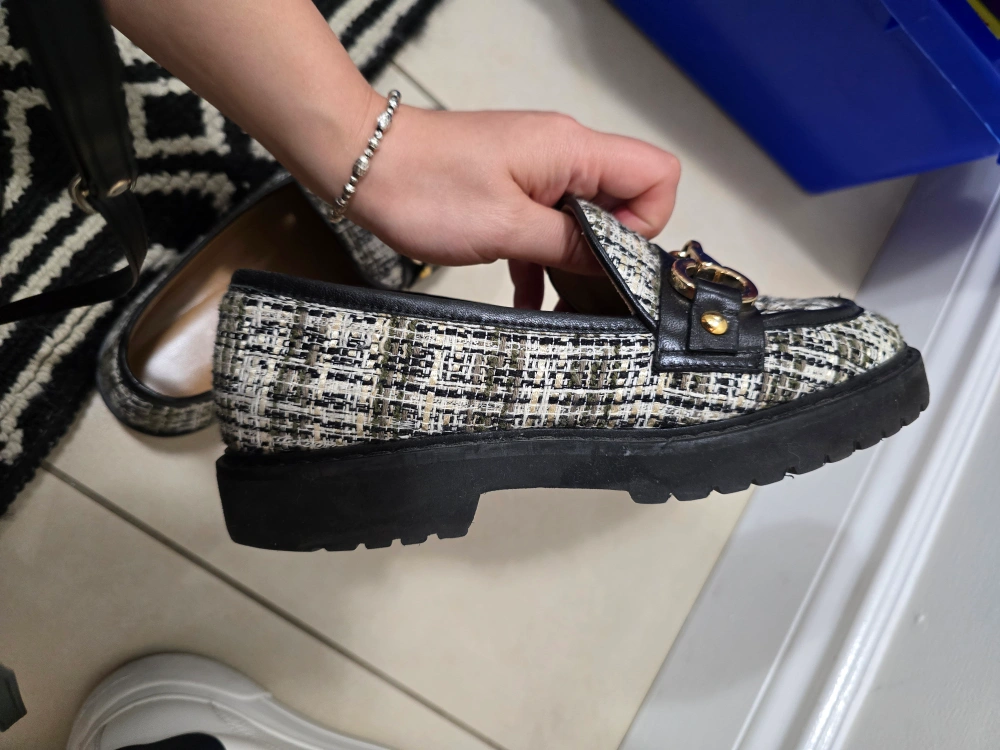 These tweed loafers are super cute and in great condition! They feature a chunky black sole and a decorative gold-tone buckle. The size is 37. Women size 7