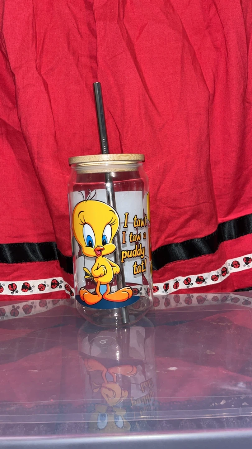 10Super cute Tweety Bird themed glass can with a straw! Perfect for your favourite cold drinks. The design features Tweety Bird with the saying 'I taw I taw a puddy tat!'