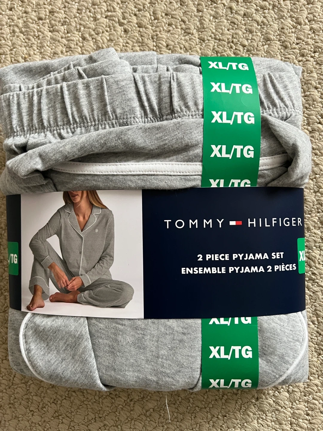 Tommy Hilfiger 2-piece pajama set in size XL. This set is a comfy grey colour and includes both the top and bottoms. Perfect for lounging around the house!