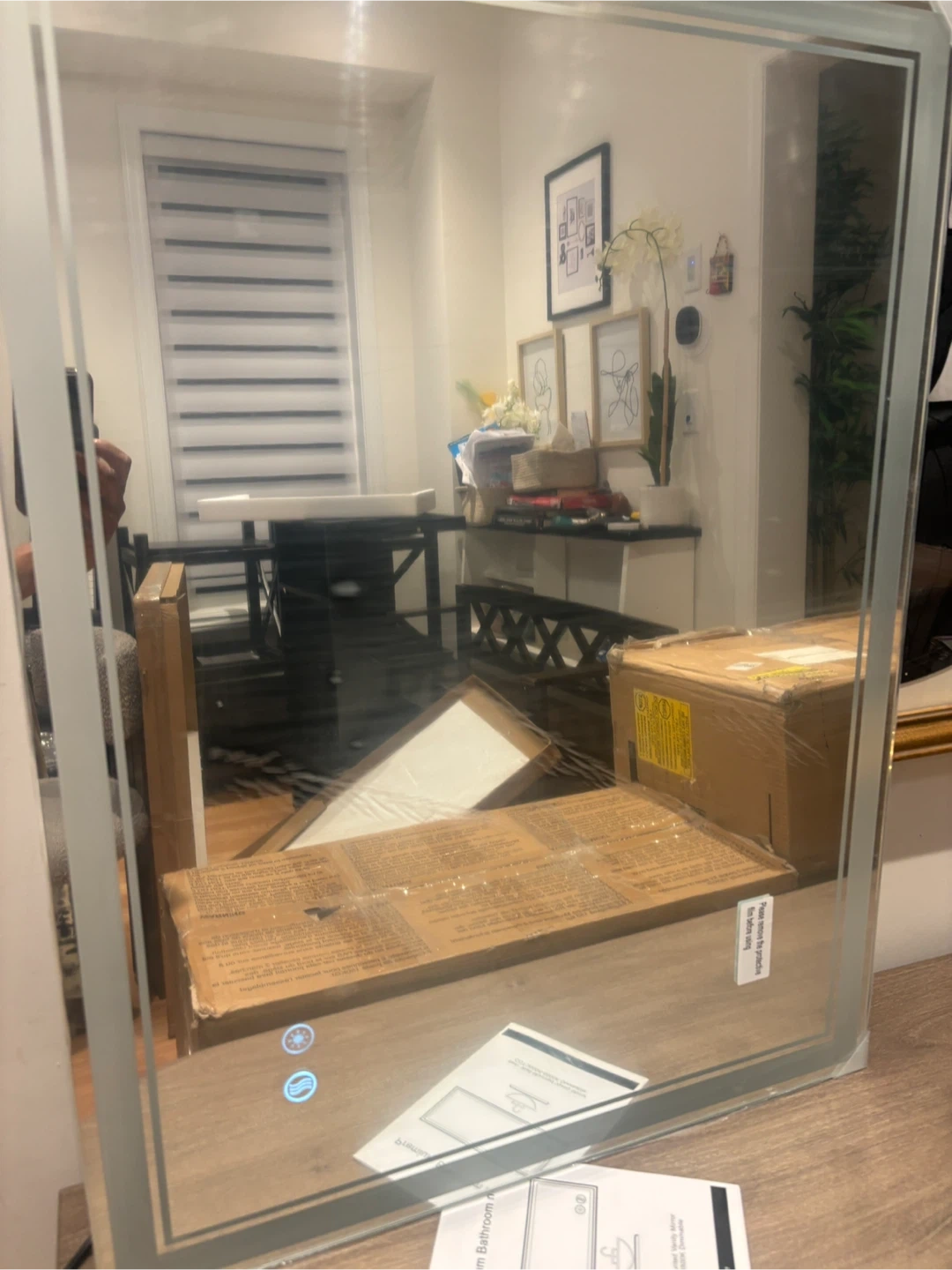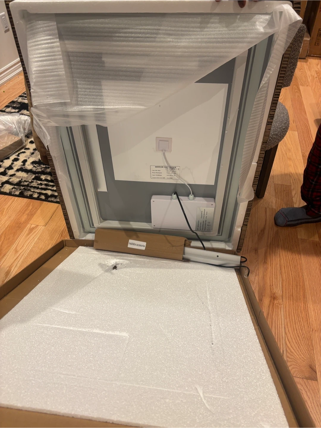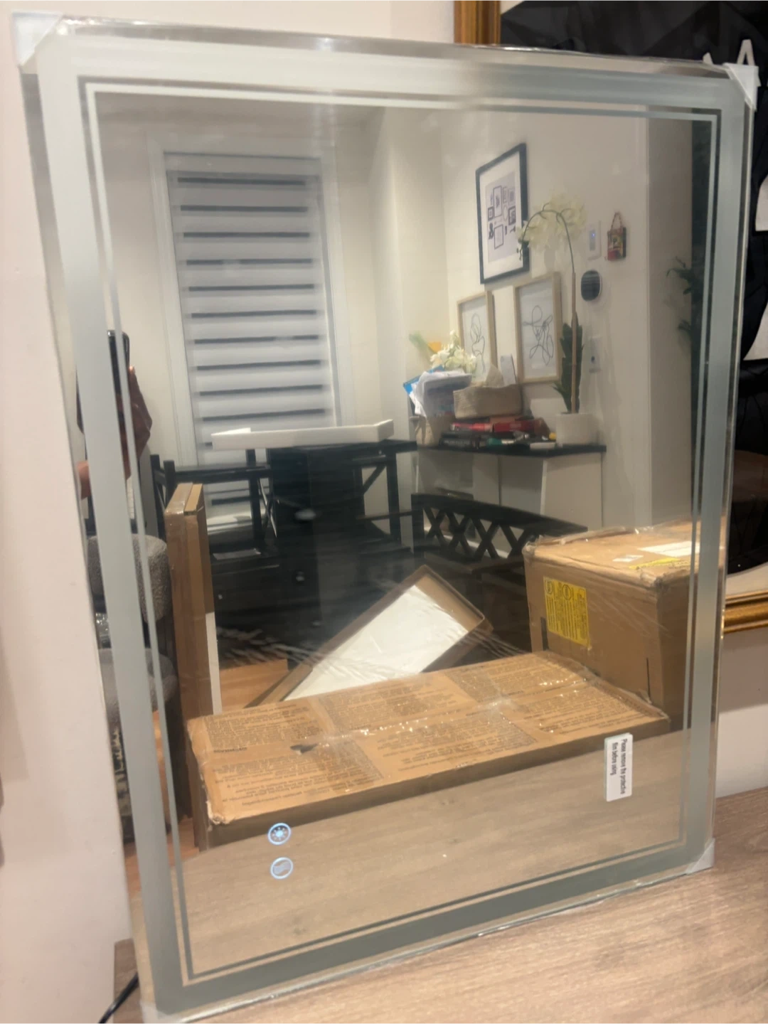 This is an LED bathroom mirror with a modern design. It features integrated lighting for a bright, clear reflection. It's suitable for any bathroom. Mountable as well. Heated function
