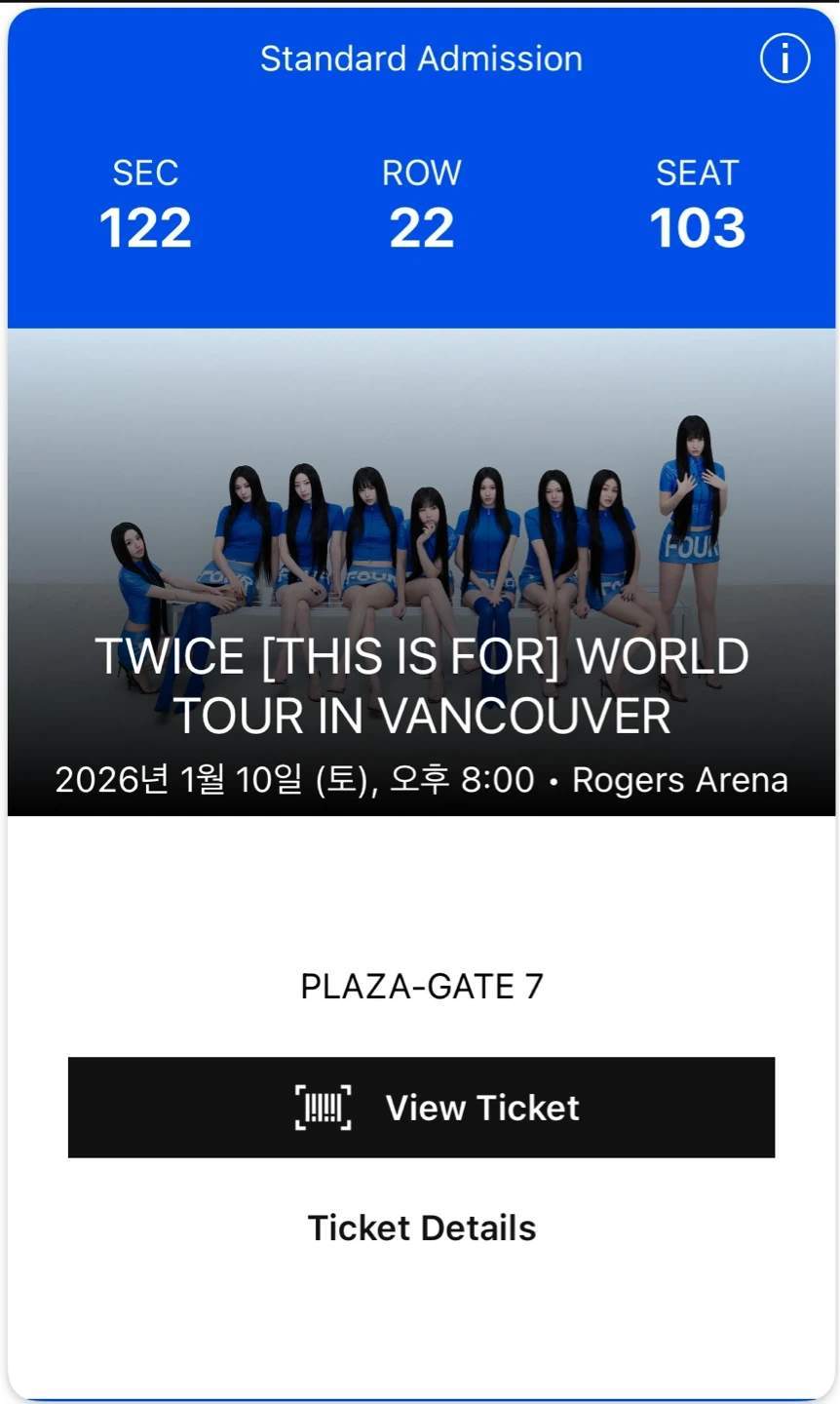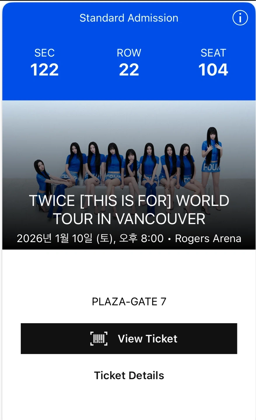 Selling two tickets to see TWICE [THIS IS FOR] World Tour in Vancouver at Rogers Arena! - Section 122 - Row 22 - Seats 103 & 104 Show is on 2026 January 10 at 8:00 PM! $400 each or $780 for both Meet up at any skytrain station for ticket transfer