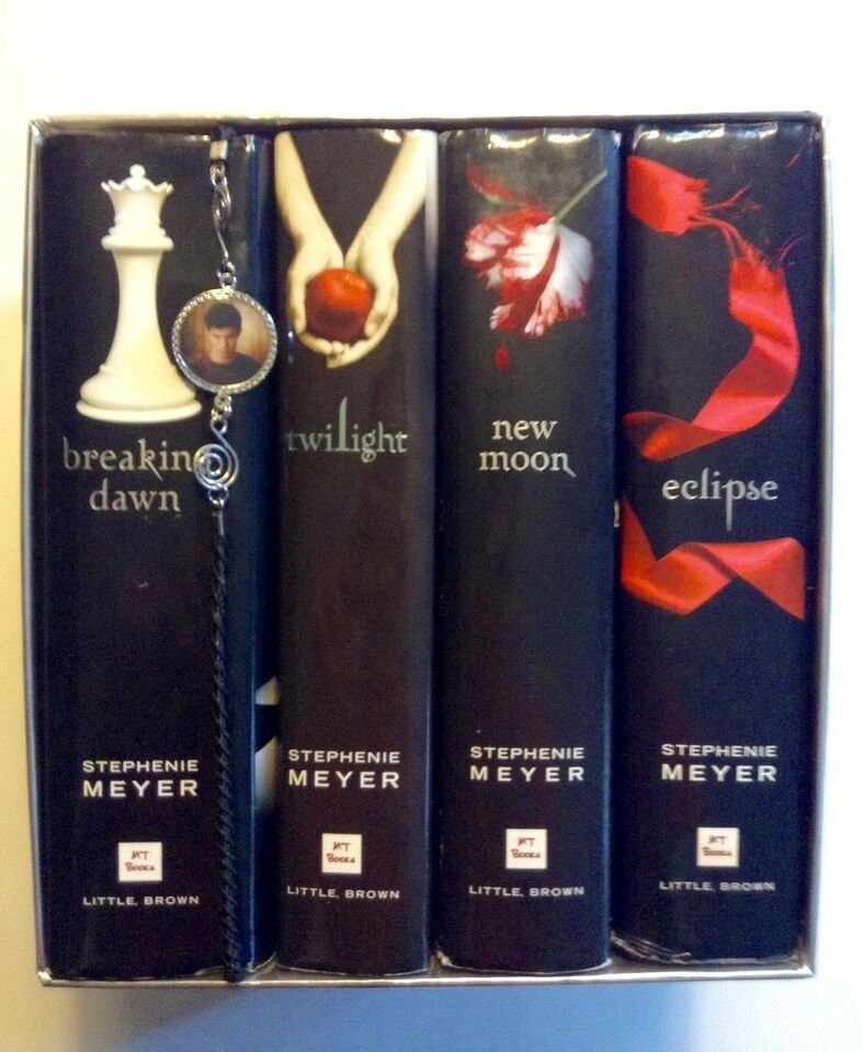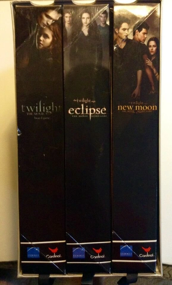 The Twilight Saga Collection Hardcover Boxed Set includes a bonus Edward bookmark and gift wrap. 2008 First Edition Twilight Saga Series Deluxe Box Set by Stephanie Meyer. Complete with 4 prints and bonus metal medallion of Edward bookmark. Hardcover: 2560 pages. Shows very little shelf wear (only from removing from box). No rips or tears, no names in the slip page. The box is in very good near new condition. Price $40 Twilight Saga Trilogy Bookshelf Game Set Includes 3 Games. A unique collectors set that includes all three of the Twilight Saga movie board games. Includes Twilight, New Moon and the New Eclipse movie games. Packaged in a deluxe bookshelf set. Add to your Twilight Collection. Official Twilight licensed product. With more than 200 images and scenes from the movies printed on the board games, it offer loads of excitement, fun and thrill. The player who collects the most scene cards is declared winner. Age: 10 years and up. Can be played by 2 to 8 players. 2 of the games have not played with. In excellent near new condition. Price $30 Bonus Hallmark Twilight New Moon Bella Jacob and Edward Gift Wrap