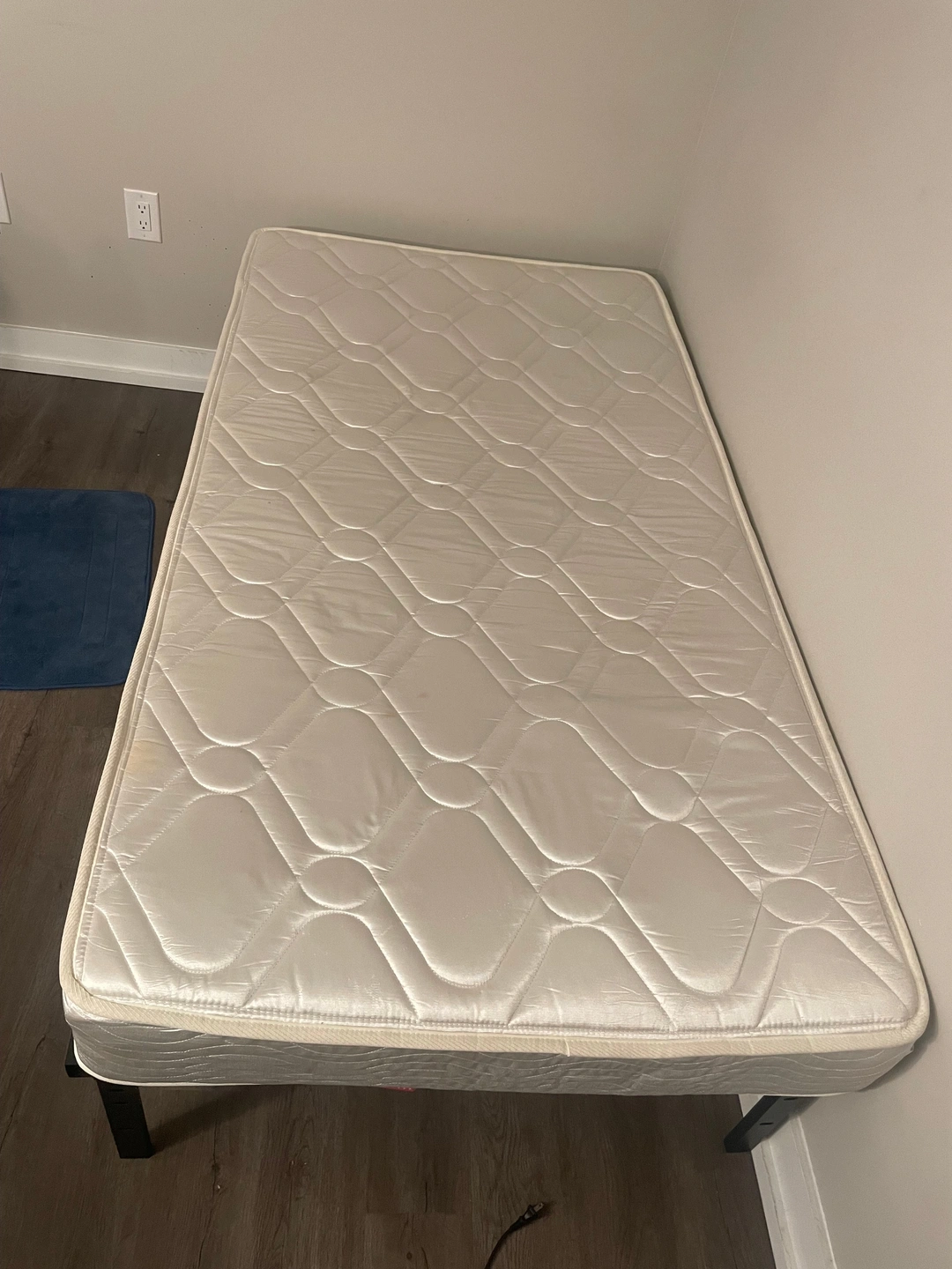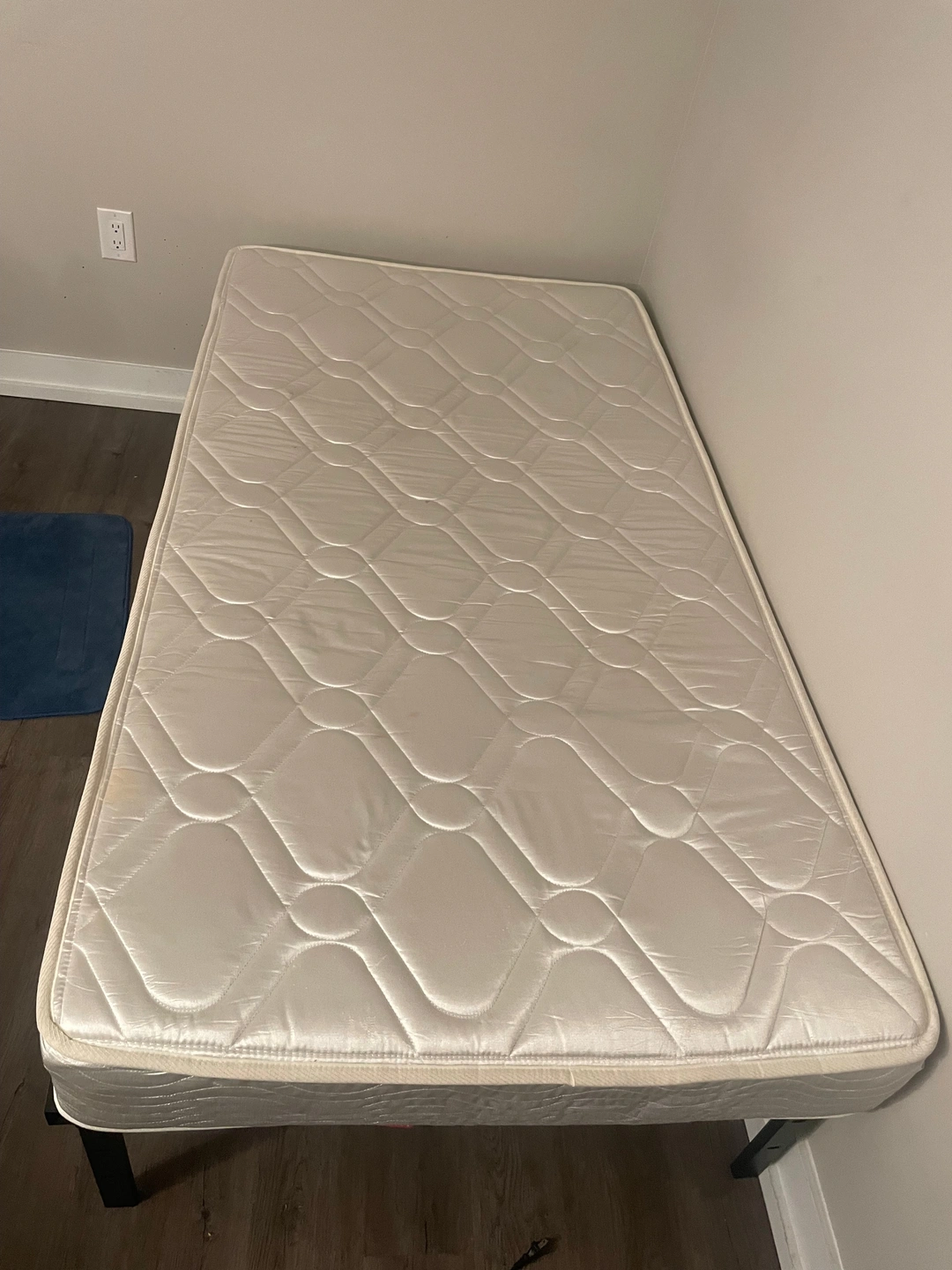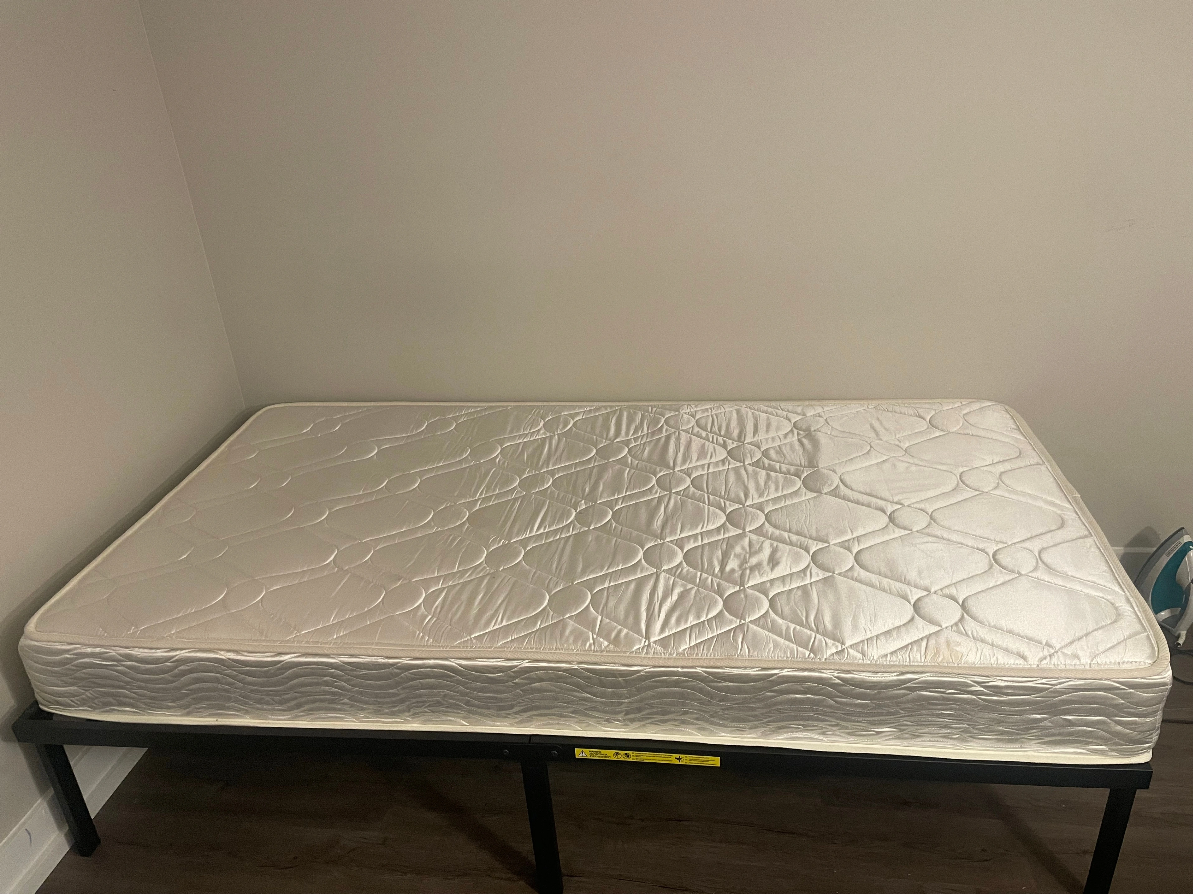 Selling a great combo purchased last November from Walmart — both in excellent condition with receipt available upon request! Mainstays Twin 14" Heavy Duty Steel Slat Platform Bed Frame Sturdy steel slat design with storage space underneath Sleek black finish, Fits Twin size mattress Zinus Spa Sensations 8-inch Support Spring Mattress Durable comfort with a perfect balance of soft foam and supportive steel innersprings Layers include 0.5" super soft foam, 0.5" high-density foam, 1" conforming ViscoLatex foam, and 6" heavy-duty steel coils CertiPUR US Certified for quality and safety Original purchase price: $248.54 — Asking only $100 for both! Ideal for a guest room, dorm, or budget-friendly upgrade. Contact me if you want the receipt or more info. pick up at 3575 kaneff crescent