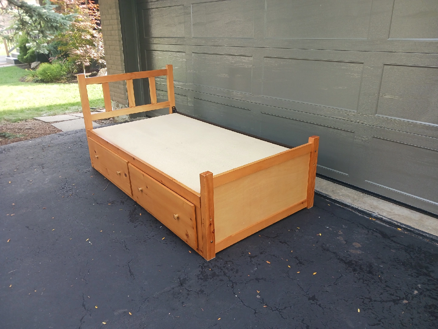 Bed frame for a twin mattress (not included), commonly called a Mates Bed. Two large drawers for storing clothing, bedding, toys, etc. Simple setup, all pieces attach together with bolts & nuts. The original instruction sheet and all hardware is included. Already disassembled. Loving used by 2 kids.