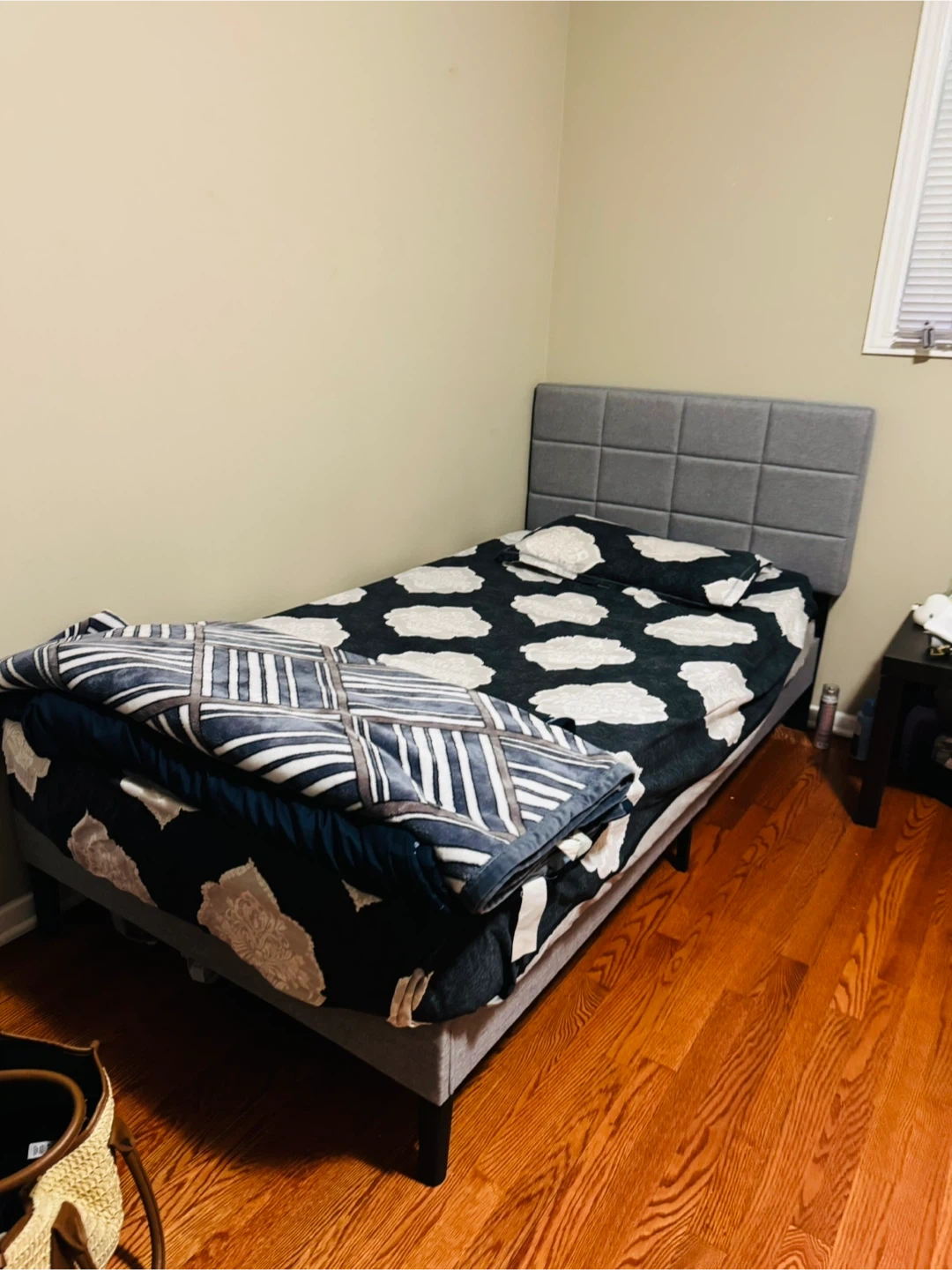 Selling a twin bed frame with a grey headboard. It's in good condition and ready for a new home. Perfect for a small space or a kid's room- Twin bed hust purachsed 3 months ago-150$ Mattress 50$