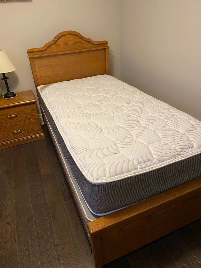 10Solid wood twin bed. Headboard, footboard, box spring, and frames included. Some minor scratches easily touched up with a furniture marker. Easy to assemble, no tools required. Box spring in excellent condition to provide good back support with a proper mattress on top of it. For sale by owner.