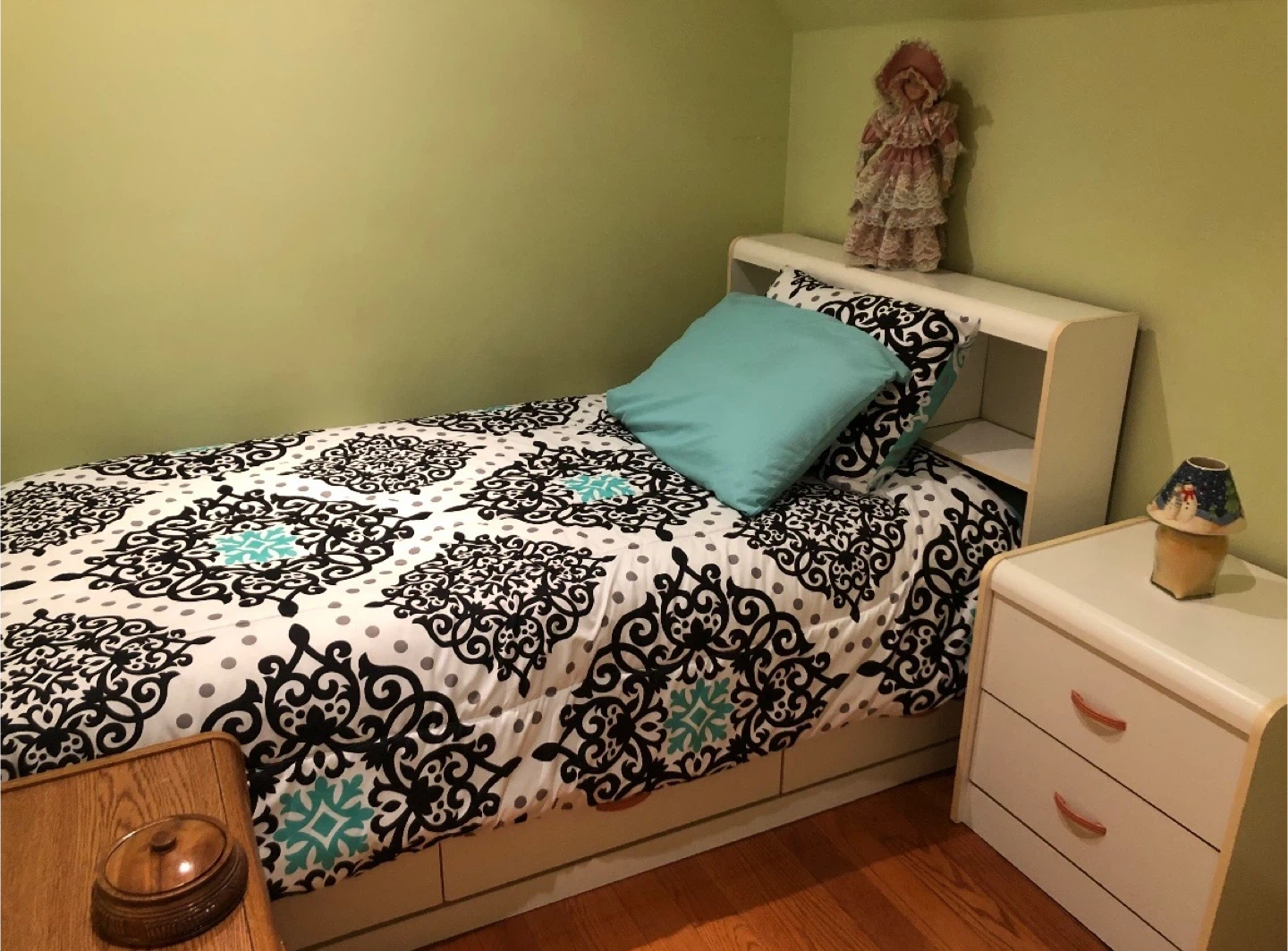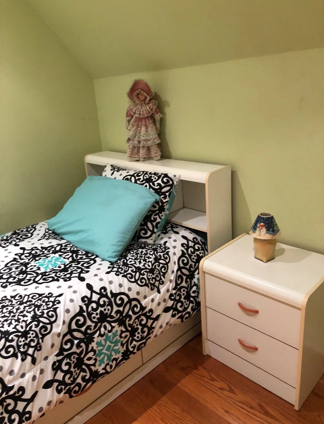 83Selling a twin bed frame with a headboard that includes a shelf. Also comes with a matching nightstand with two drawers. Comes with new mattress and comforter. Perfect for a kid's room or a guest room! Need it gone asap. Pickup only.