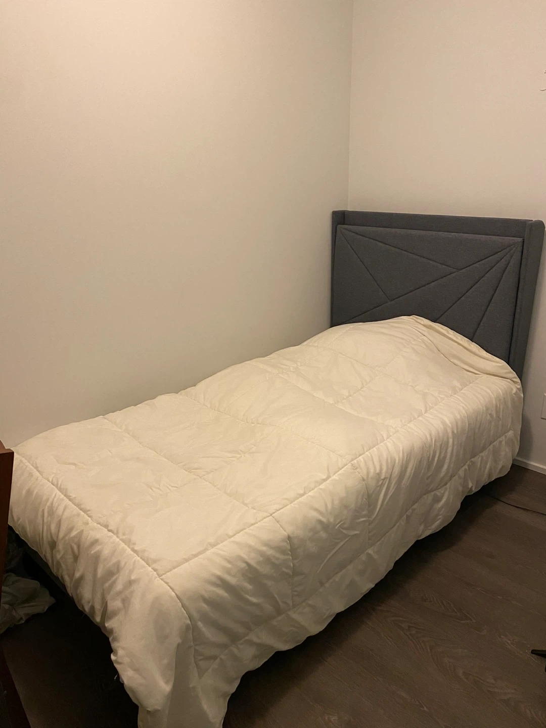 Selling a twin bed frame with a stylish headboard! It's in great condition and ready for a new home. The headboard features a geometric design in a neutral gray color that would fit any room decor. Perfect for a small space or a guest room