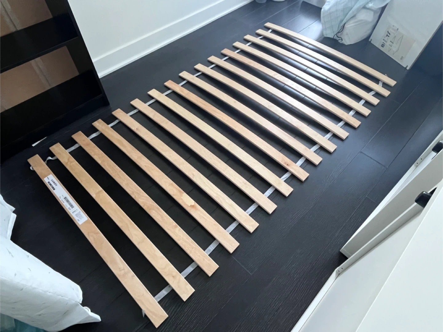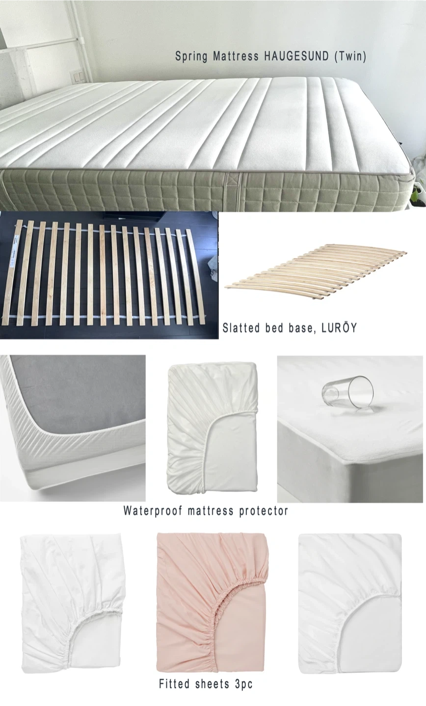53All for $ 80 Individual purchase is possible, but I prefer a full-set buyer. 1️⃣ Spring Mattress HAUGESUND - $60 The mattress was always covered with a waterproof protector and two layers of sheets. So it’s very clean and in great condition. 2️⃣ Slatted bed base, LURÖY - $15 3️⃣ Waterproof mattress protector - $ 10 4️⃣ Fitted sheets 3pc - $ 15 🚚 Moving sale until mid-December — don’t miss out on great deals! 👍🏻 Only cash and Pick up Please, No Return Check out my other listings😊 (A small discount is available if you buy this along with my other listed items.)