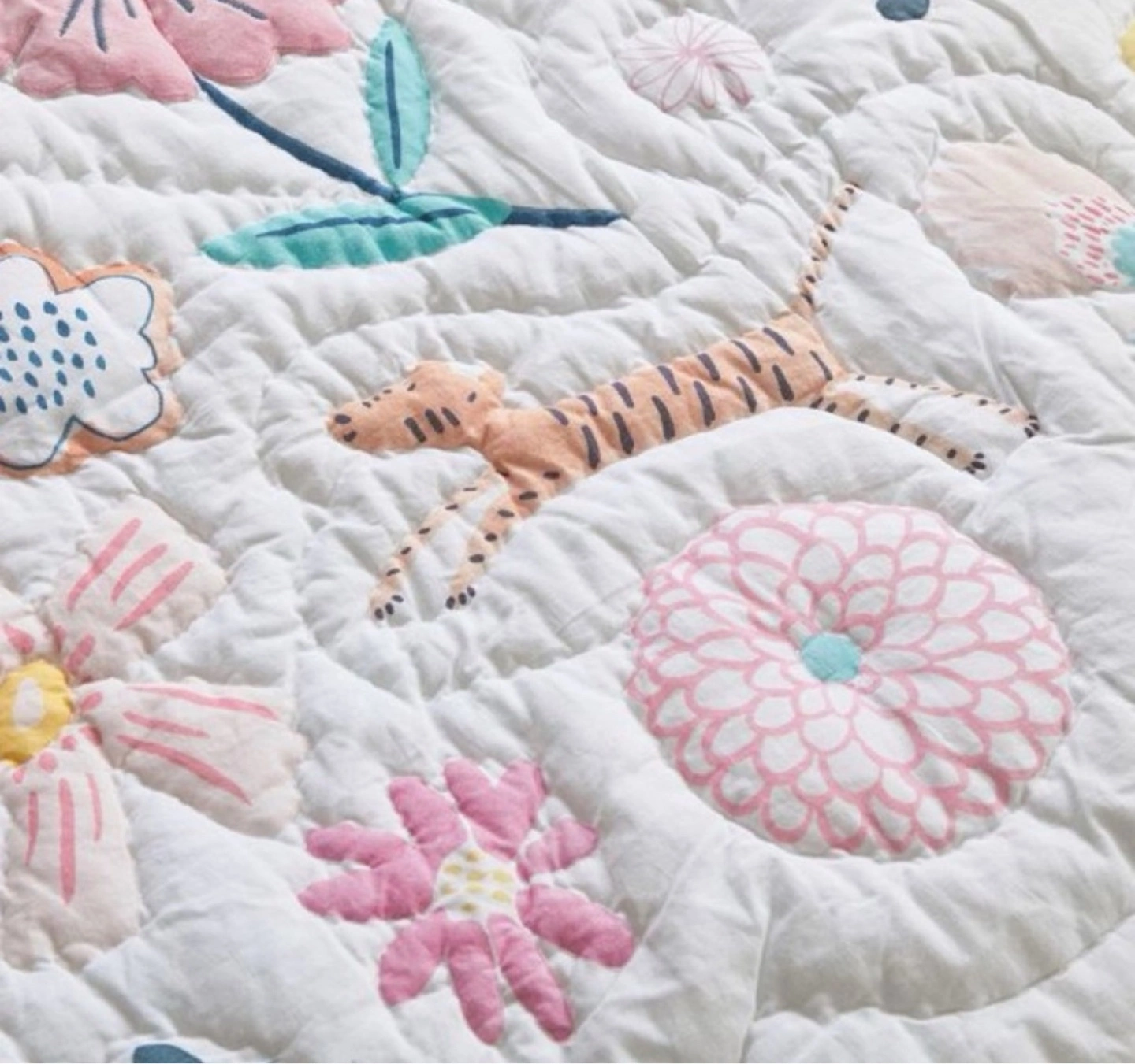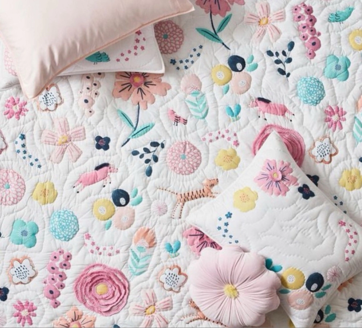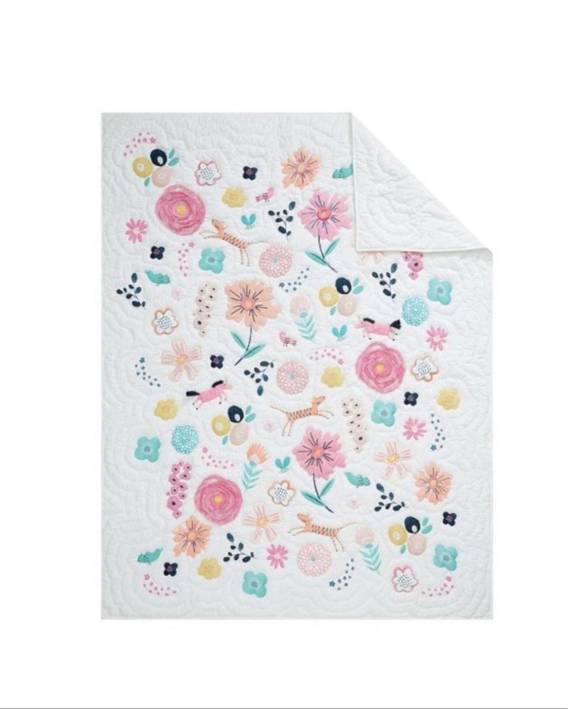101Everything’s coming up roses and peonies on this Sasha’s Garden Quilt and Sham. Strewn with appliquéd flowers and frolicsome animal friends, it’s beautifully crafted from pure cotton that’s Better Cotton certified for a healthier night’s sleep. Made of 100% cotton. Quilt is filled with 100% polyester batting. Quilt and shams reverse to solid. Quilted shams have envelope closures. Single: 68" wide x 86" long Standard Sham: 26" wide x 20" high Machine wash cold water, gentle cycle. Use only non-chlorine bleach, if needed. Tumble dry on low heat; remove promptly. Warm iron as needed. Can be dry-cleaned. Machine wash. Imported.