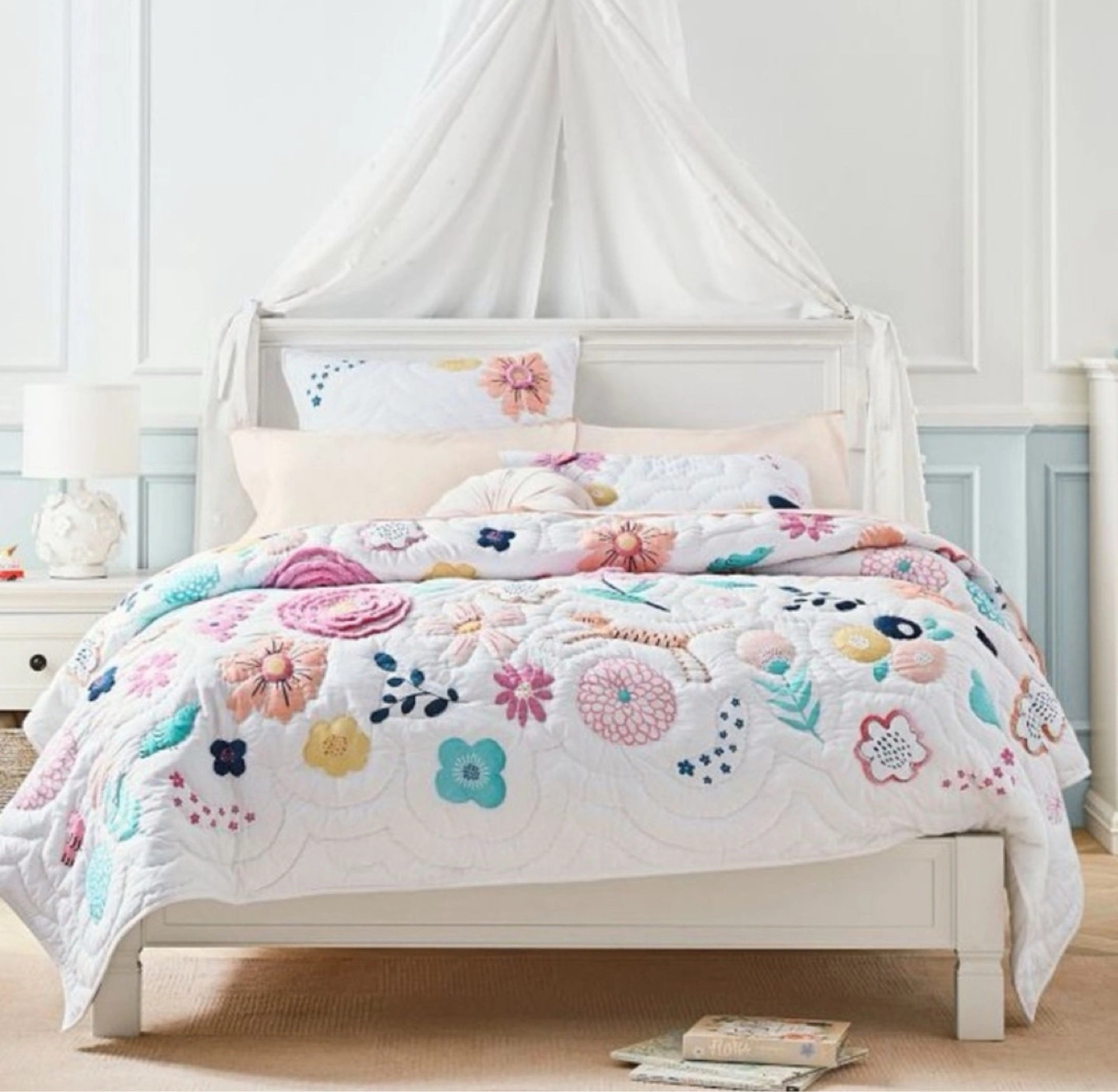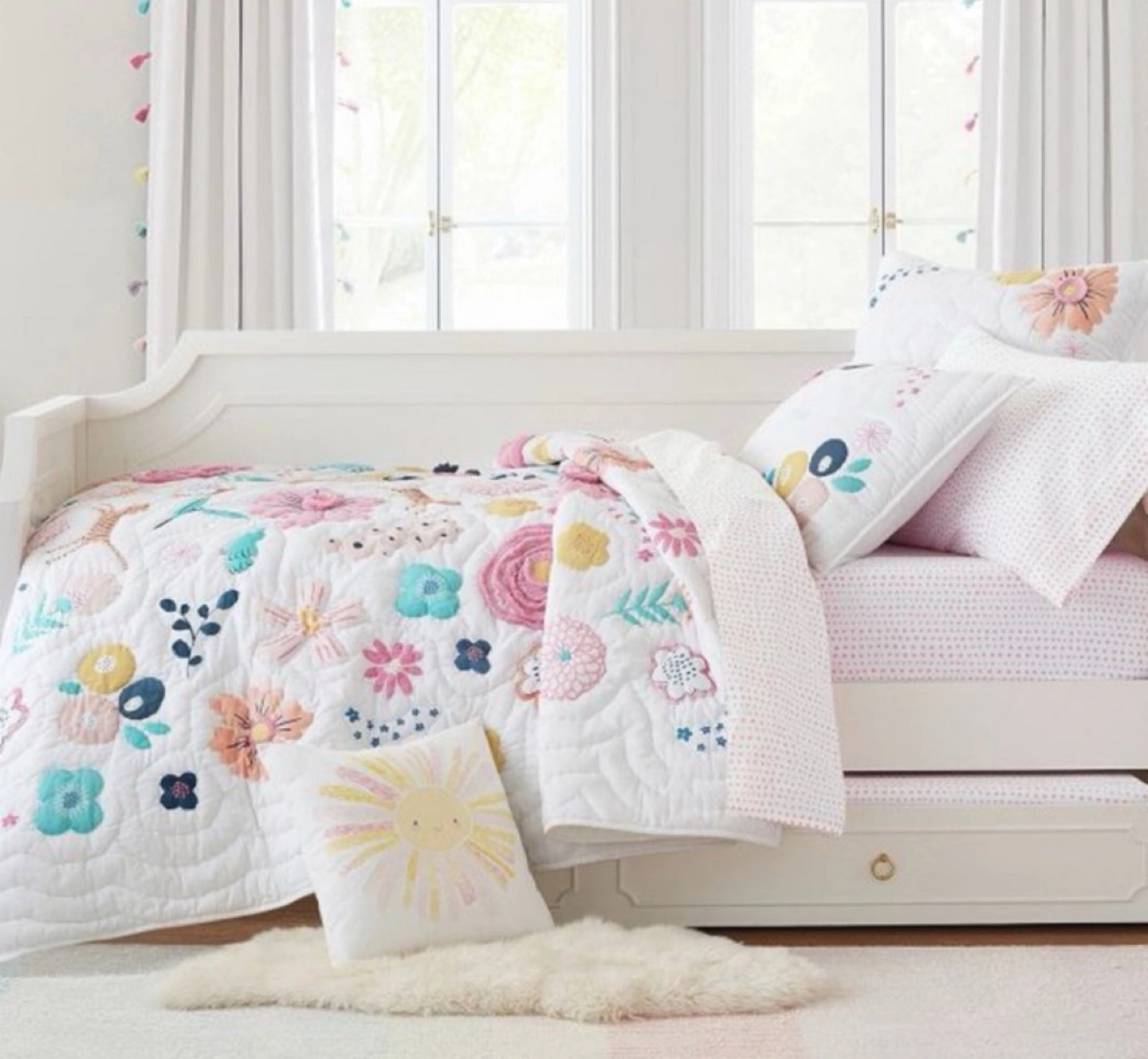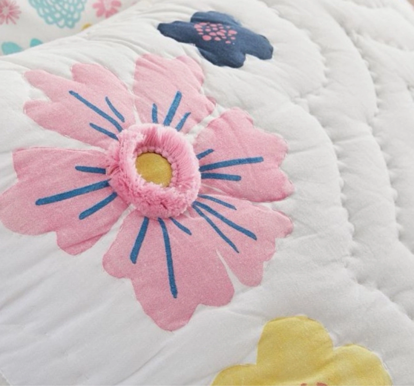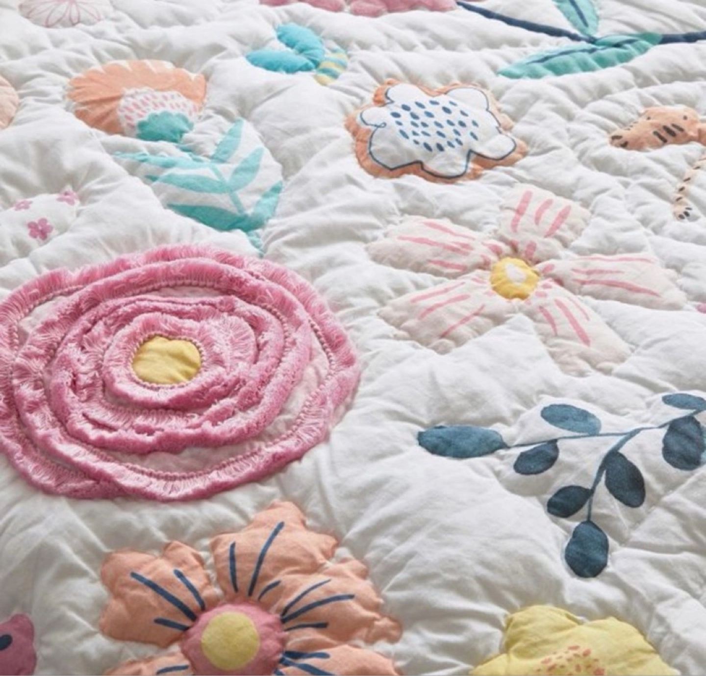 101Everything’s coming up roses and peonies on this Sasha’s Garden Quilt and Sham. Strewn with appliquéd flowers and frolicsome animal friends, it’s beautifully crafted from pure cotton that’s Better Cotton certified for a healthier night’s sleep. Made of 100% cotton. Quilt is filled with 100% polyester batting. Quilt and shams reverse to solid. Quilted shams have envelope closures. Single: 68" wide x 86" long Standard Sham: 26" wide x 20" high Machine wash cold water, gentle cycle. Use only non-chlorine bleach, if needed. Tumble dry on low heat; remove promptly. Warm iron as needed. Can be dry-cleaned. Machine wash. Imported.