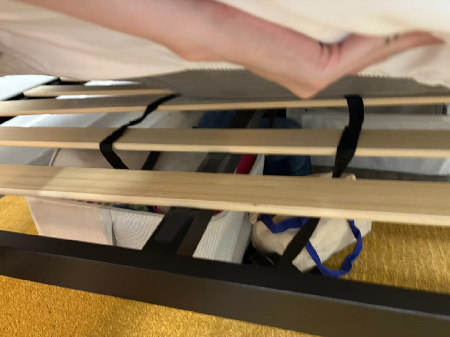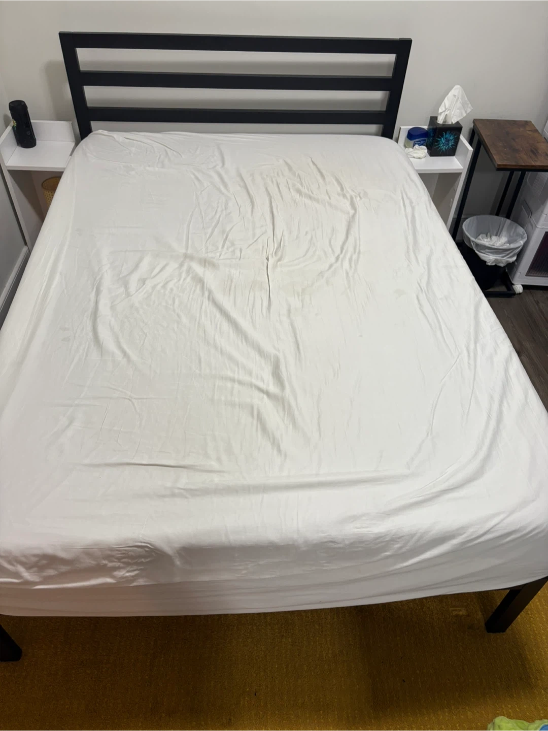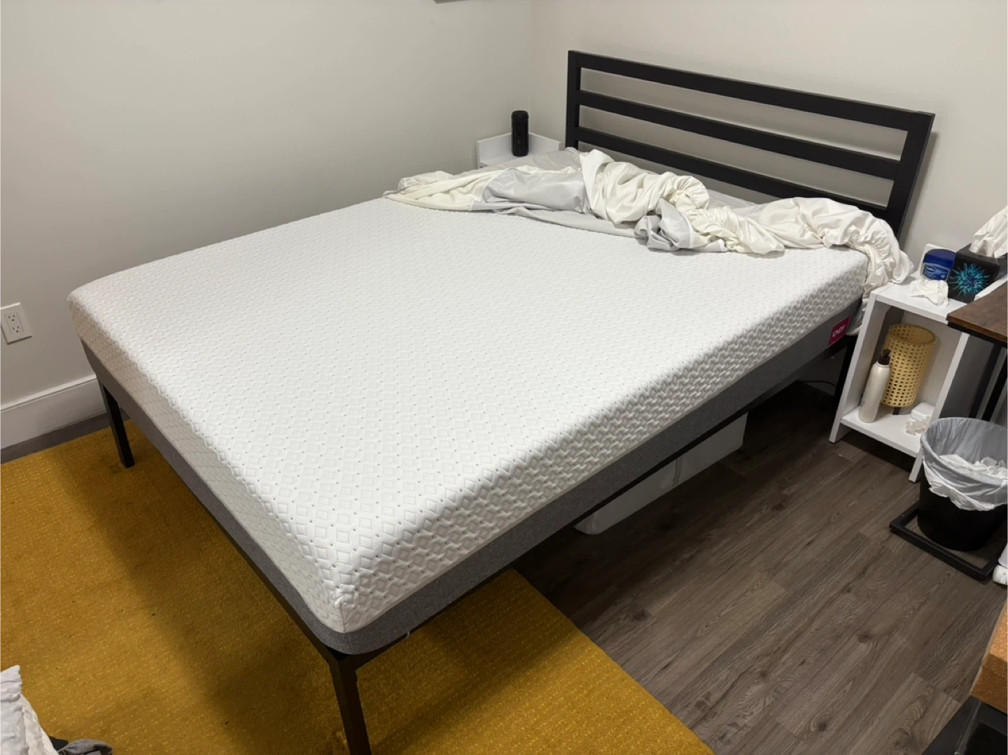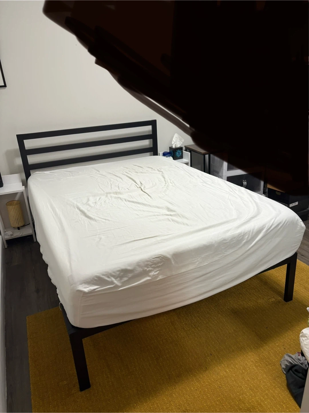 MUST GO ASAP! I am moving! Pickup in West Etobicoke; Bloor & The East Mall. Selling a twin size bed frame and mattress. The frame is black metal with 2 rows of wooden slats underneath. Bedframe: IKEA Mattress: ENDY What’s included for this price: The Endy mattress (twin size) The bed frame Mattress protective cover Two fitted sheets Two flat sheets Dimensions for both listed in the pictures. IF YOU’D LIKE AN INDIVIDUAL PIECE, MATTRESS OR BEDFRAME, HERE ARE THE PRICES: Mattress sold separately: $200 Bedframe sold separately: $100 It’s currently still put together. If you’d like it disassembled, please let me know. The mattress protective cover has a couple stains, but the mattress itself isn’t stained. Cash most preferred.