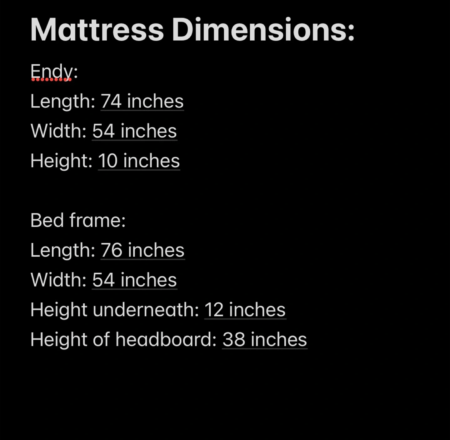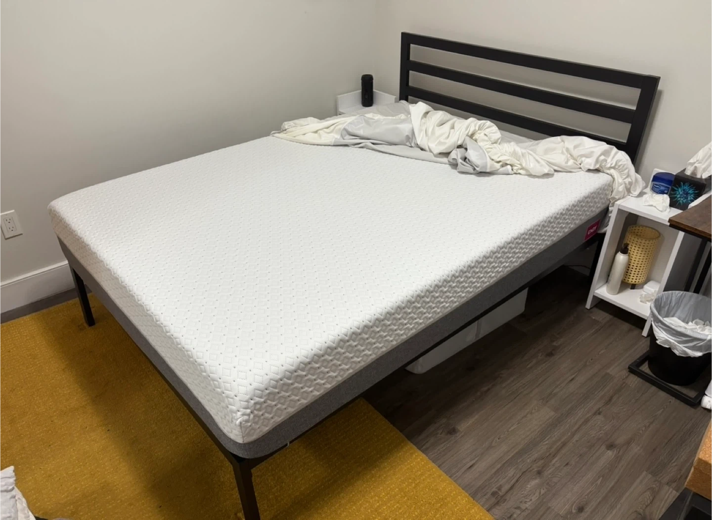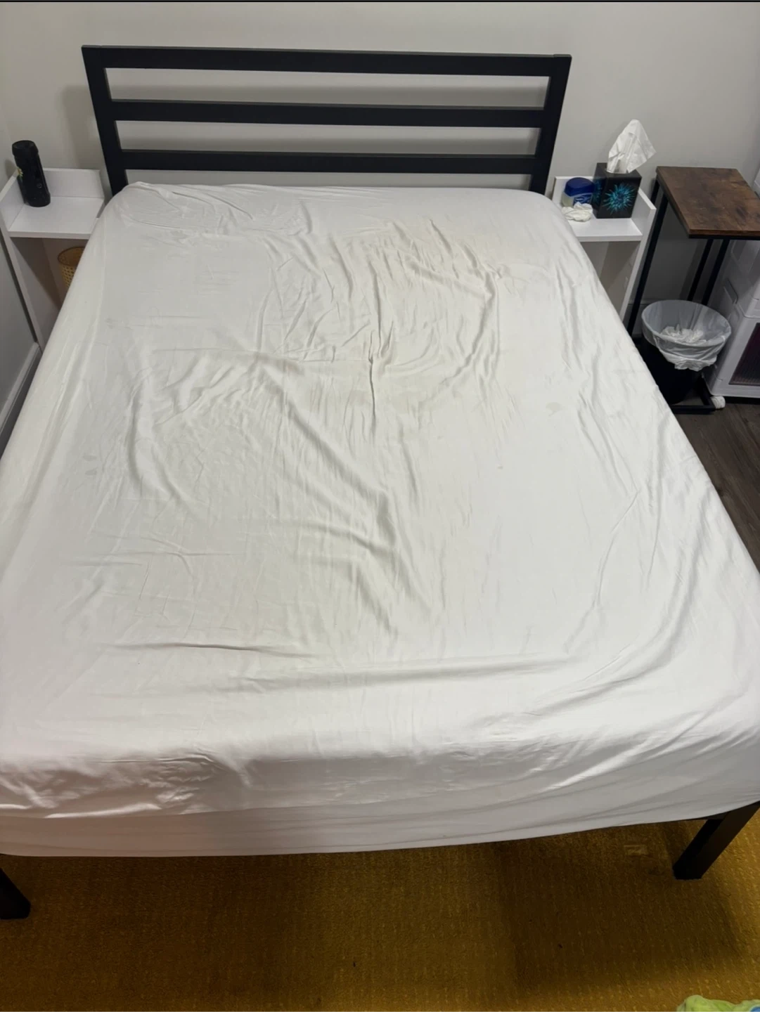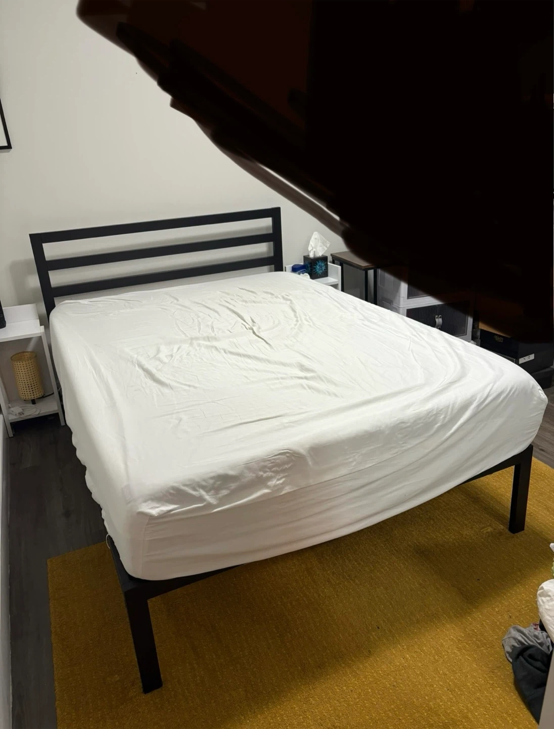 MUST GO ASAP! I am moving! Pickup in West Etobicoke; Bloor & The East Mall. Selling a twin size bed frame and mattress. The frame is black metal with 2 rows of wooden slats underneath. Bedframe: IKEA Mattress: ENDY What’s included for this price: The Endy mattress (twin size) The bed frame Mattress protective cover Two fitted sheets Two flat sheets Dimensions for both listed in the pictures. IF YOU’D LIKE AN INDIVIDUAL PIECE, MATTRESS OR BEDFRAME, HERE ARE THE PRICES: Mattress sold separately: $200 Bedframe sold separately: $100 It’s currently still put together. If you’d like it disassembled, please let me know. Cash most preferred.