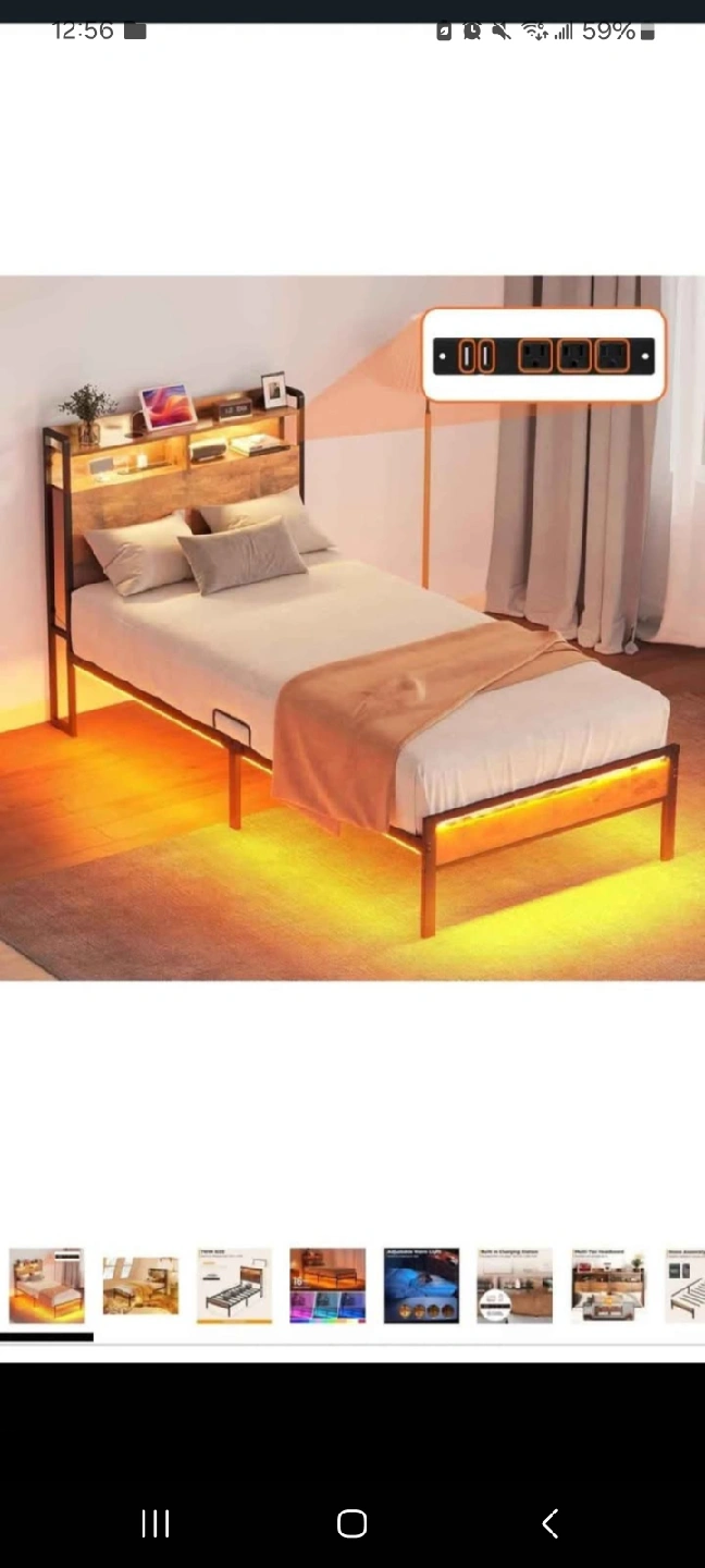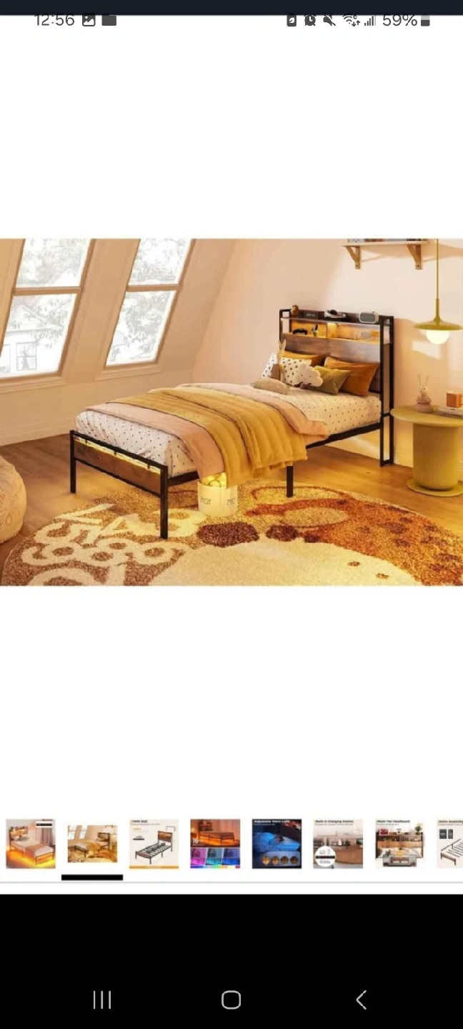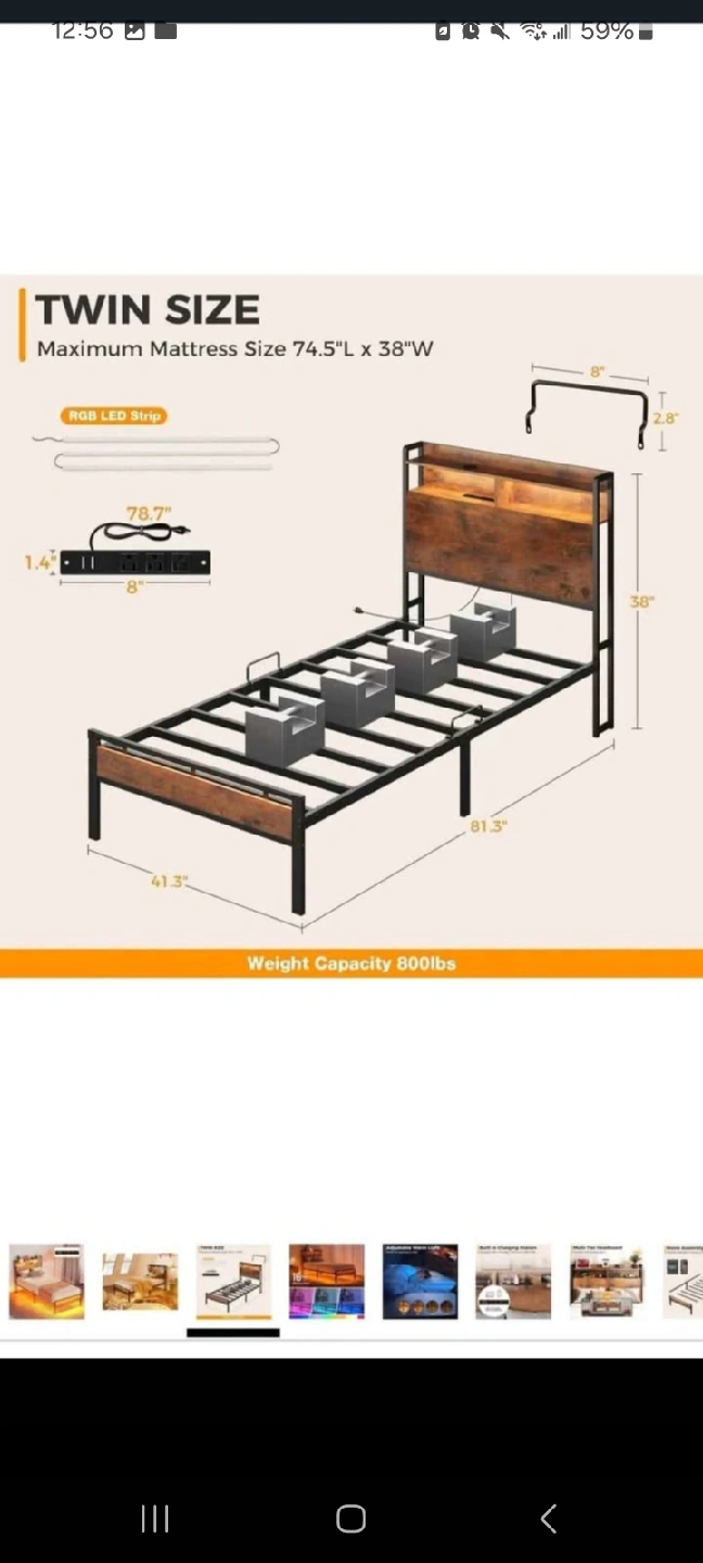 5Selling a twin size bed frame with a headboard. The maximum mattress size is 74.5" L x 38" W. It also features an RGB LED strip, phone and watch charging port, adding a nice touch to any bedroom. Weight capacity is 800lbs
