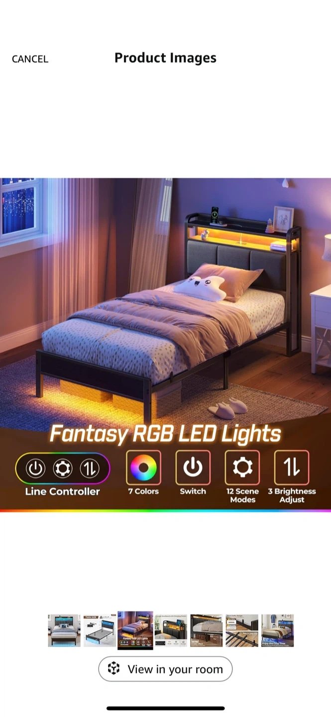 0Selling a twin size bed frame that features cool RGB LED lights! The dimensions are 82.3" L x 39.4" W x 43.3" H. It has 7 colors, a switch, 12 scene modes, and 3 brightness adjustments, all controlled by a line controller+ mattress