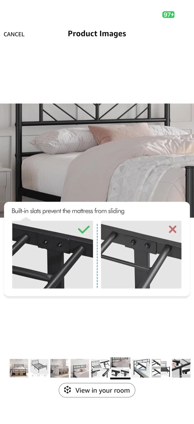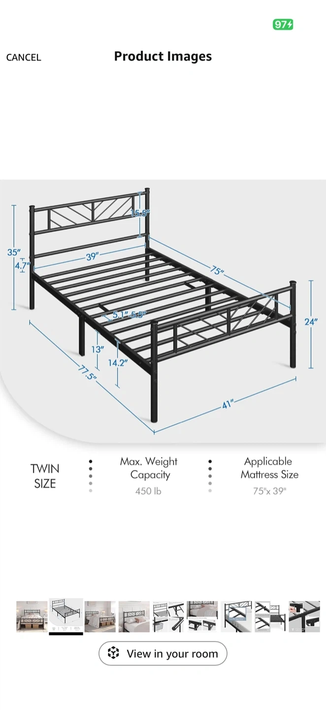 60Selling a twin-size metal bed frame! It features an arrow design and superior metal tubes for extended use. There's also ample under-bed room to maximize your storage space. The bottom rubber caps keep your floor away from damage, and the built-in slats prevent the mattress from sliding. The applicable mattress size is 75" x 39". Can fit in a small box when disassembled, super convenient to move.