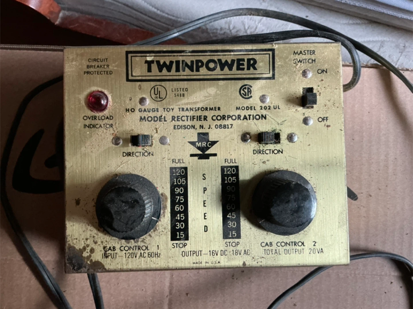 10Selling a Twinpower HO Gauge Toy Transformer, model 202 UL. It features a master switch, overload indicator, and direction controls. It has two cab controls, each with an input of 120V AC 60Hz and an output of 16V DC 18V AC. The total output is 20VA. It's a great piece for any model train enthusiast!