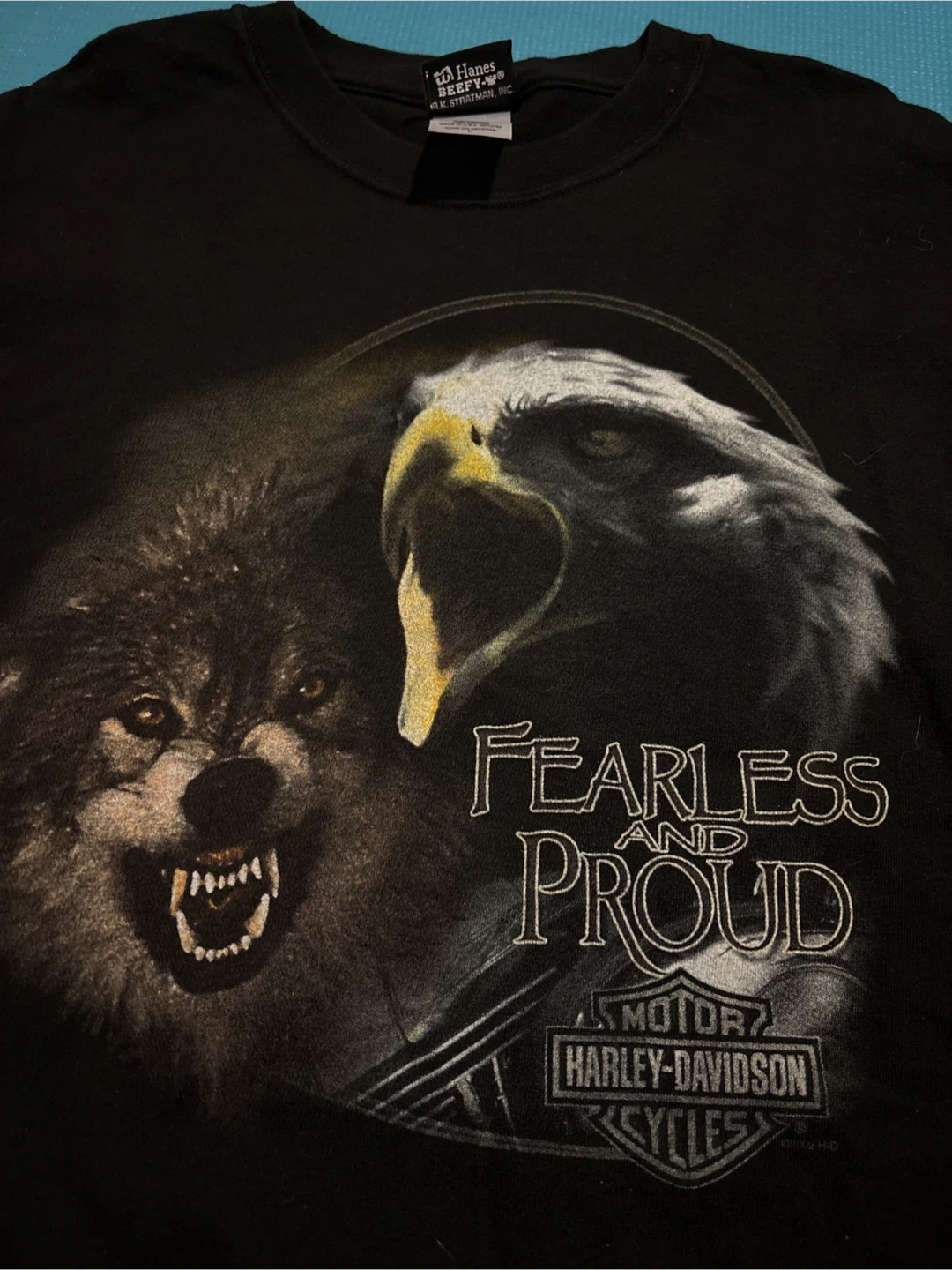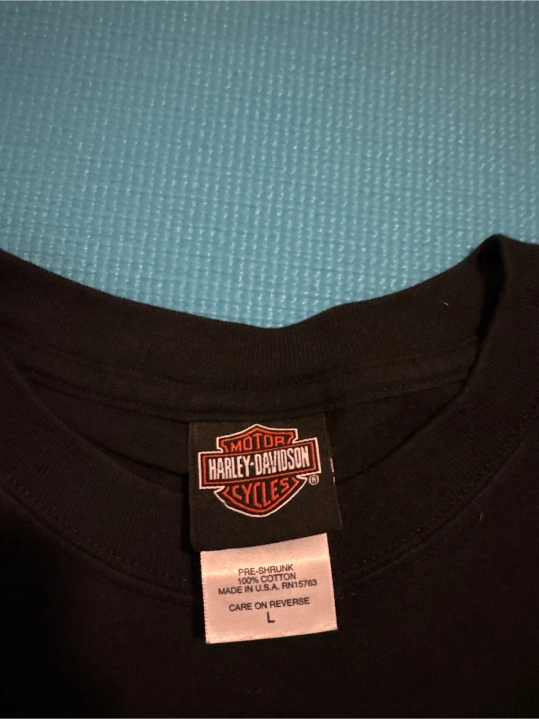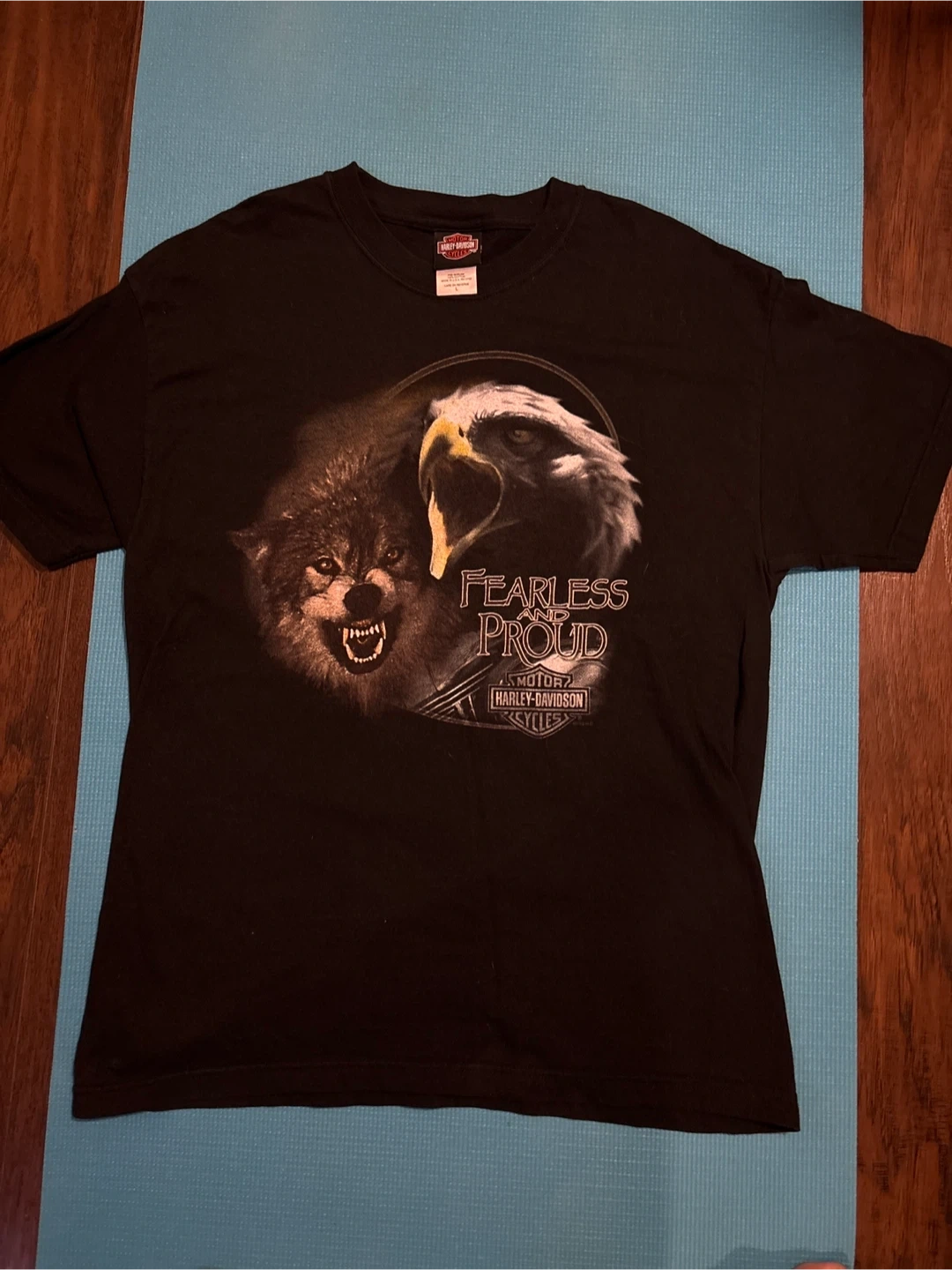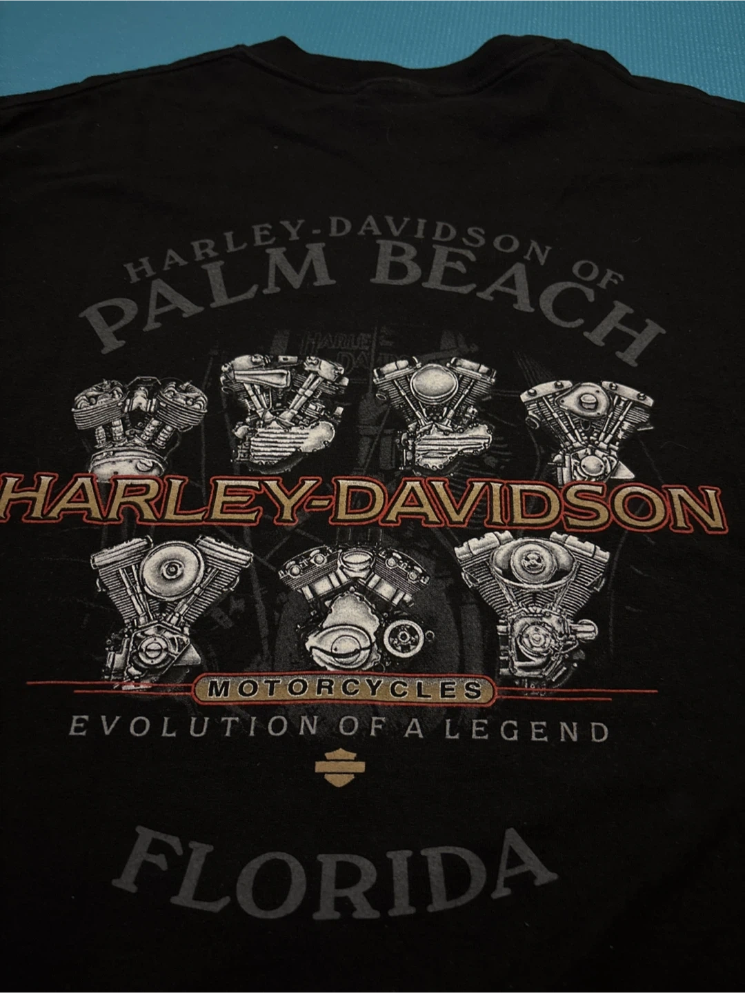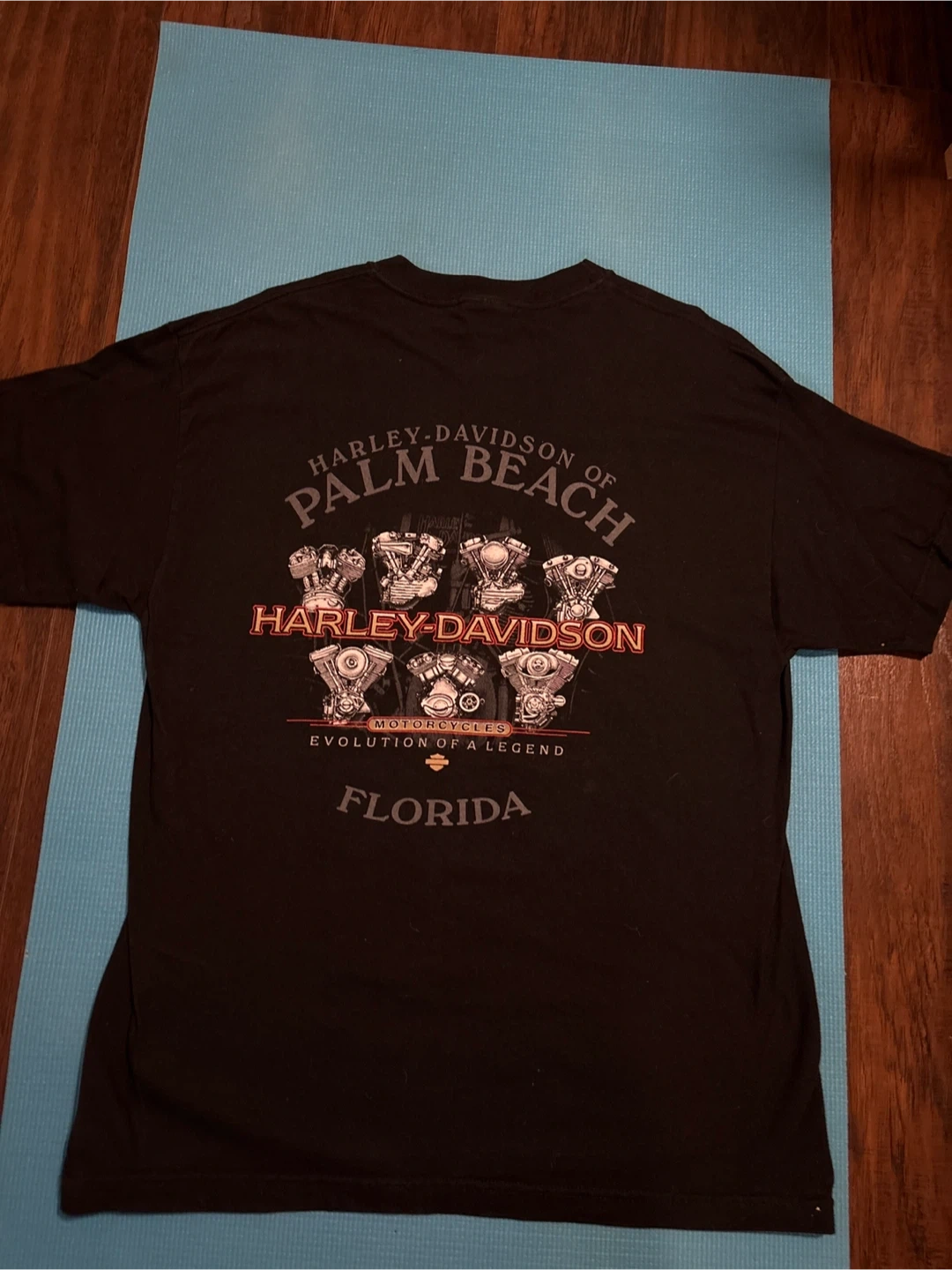 Selling a Harley-Davidson t-shirt in size large. It's black and made of 100% cotton. The shirt features various Harley-Davidson designs, including the Palm Beach edition and a wolf/eagle graphic. It's pre-shrunk and made in the U.S.A.