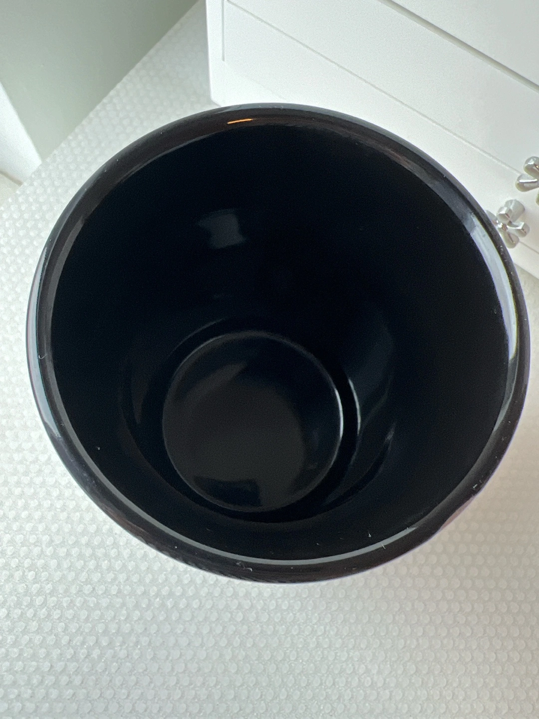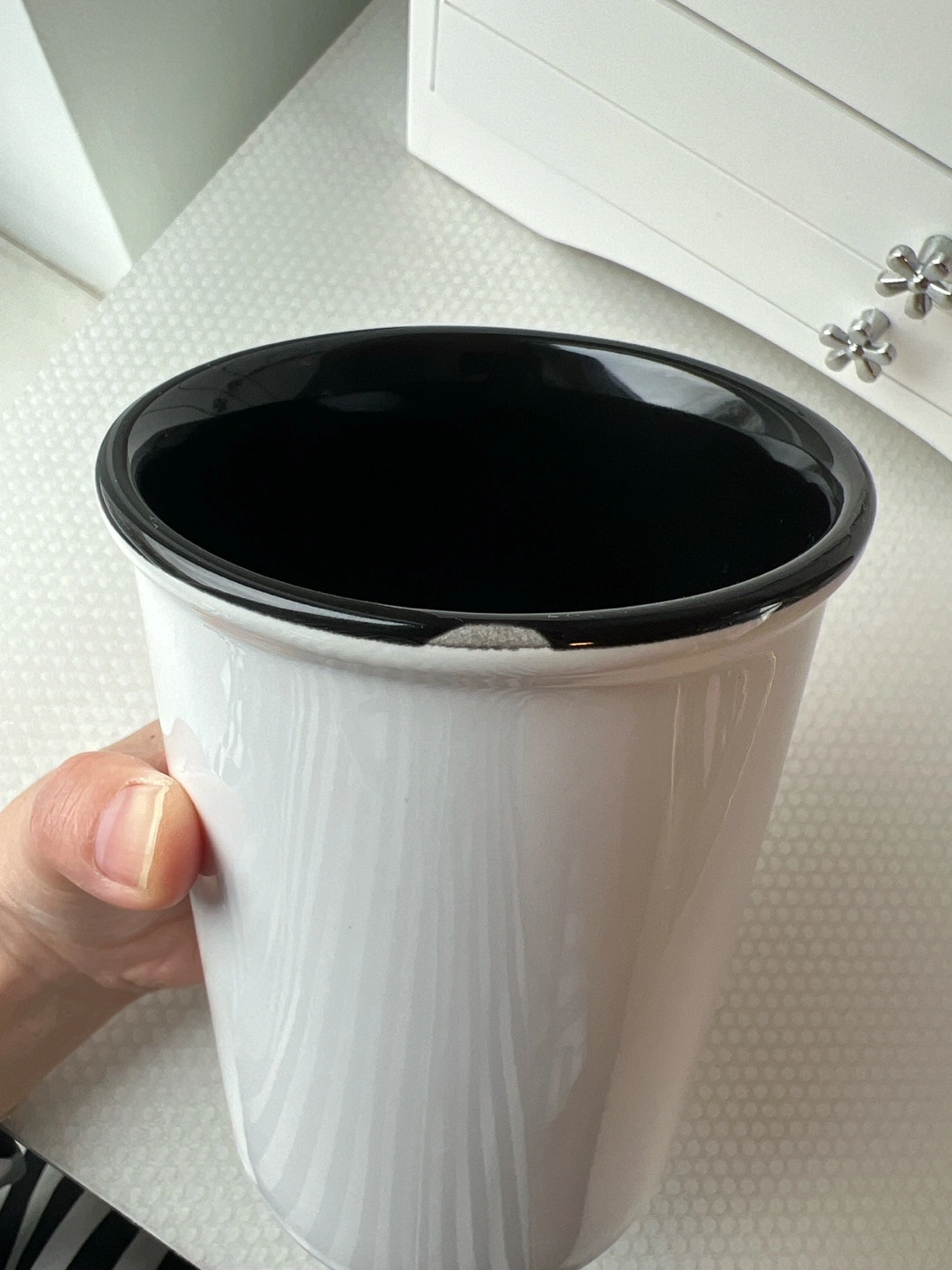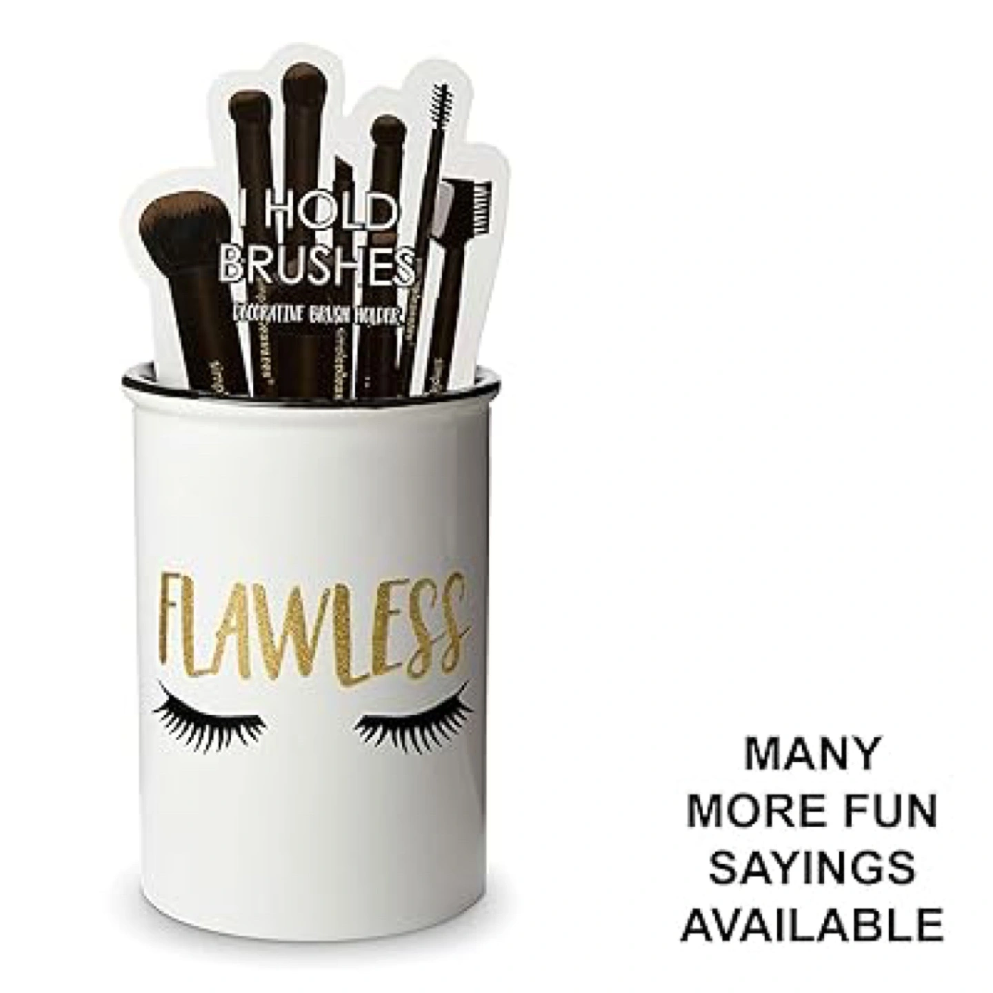 Ceramic makeup brush holder. Black interior. Gold lettering. Eyelash design. Holds several brushes.